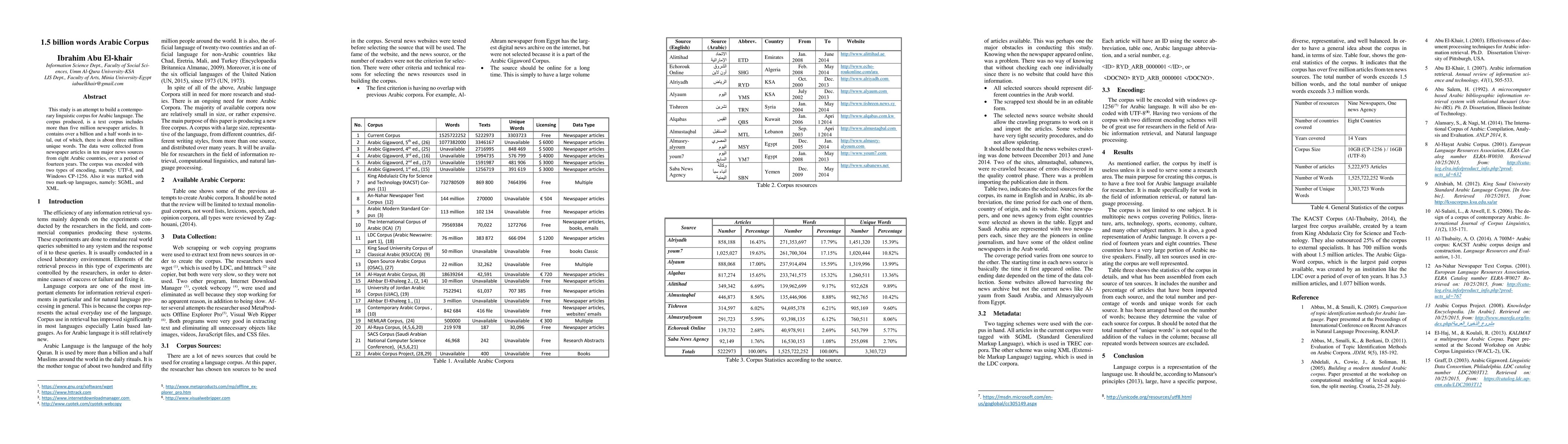 This study constructs a contemporary Arabic linguistic corpus comprising over 1.5 billion words from five million newspaper articles collected over 14 years from ten major news sources in eight Arabic countries. The corpus is encoded in UTF-8 and Windows CP-1256, and marked with SGML and XML.