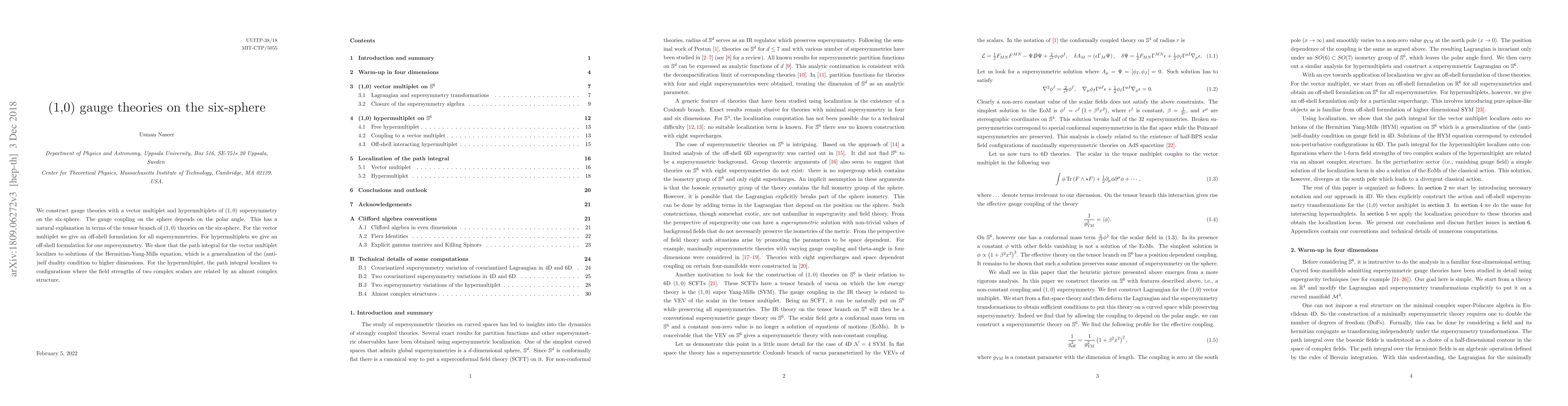 We construct gauge theories with a vector-multiplet and hypermultiplets of $(1,0)$ supersymmetry on the six-sphere. The gauge coupling on the sphere depends on the polar angle. This has a natural explanation in terms of the tensor branch of $(1,0)$ theories on the six-sphere. For the vector-multiplet we give an off-shell formulation for all supersymmetries. For hypermultiplets we give an off-shell formulation for one supersymmetry. We show that the path integral for the vector-multiplet localizes to solutions of the Hermitian-Yang-Mills equation, which is a generalization of the (anti-)self duality condition to higher dimensions. For the hypermultiplet, the path integral localizes to configurations where the field strengths of two complex scalars are related by an almost complex structure.