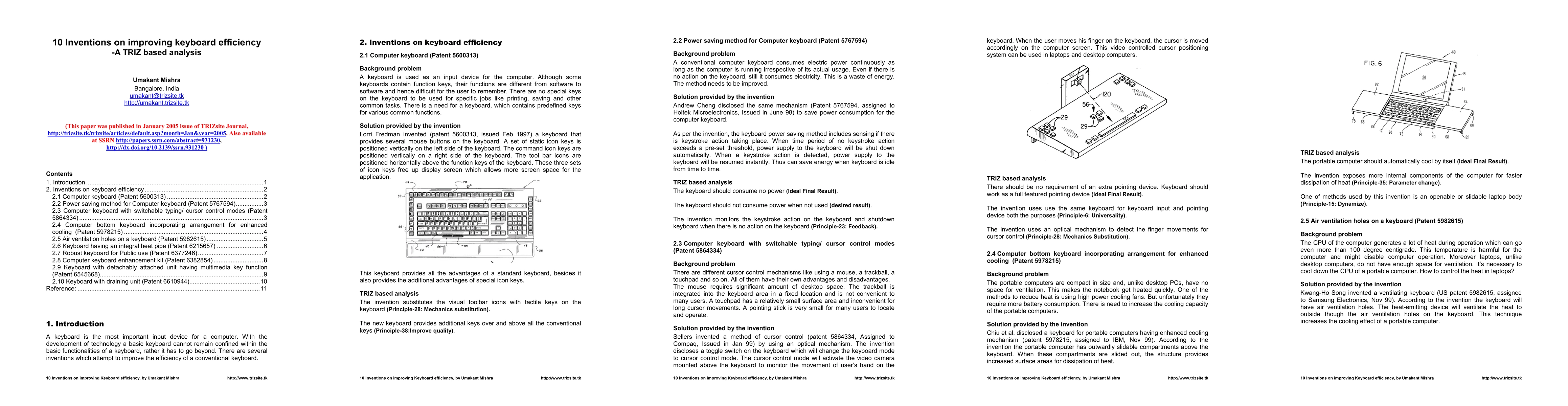 This paper analyzes ten inventive keyboard efficiency improvements from the US Patent database, employing TRIZ principles to explore contradictions and solutions. The inventions include innovative features like toolbar buttons, power saving, cooling mechanisms, robust designs, and enhancements for children.