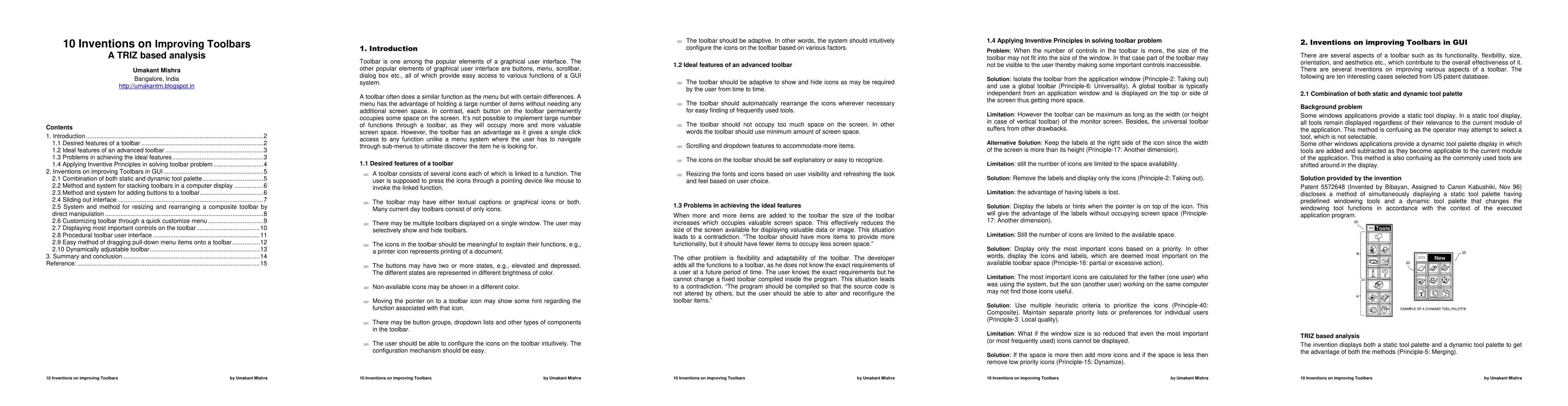 This paper analyzes toolbars in graphical user interfaces using TRIZ principles to identify contradictions in their design and proposes inventive solutions. It highlights ten patents that illustrate practical improvements to toolbar functionality, balancing space efficiency and ease of access.