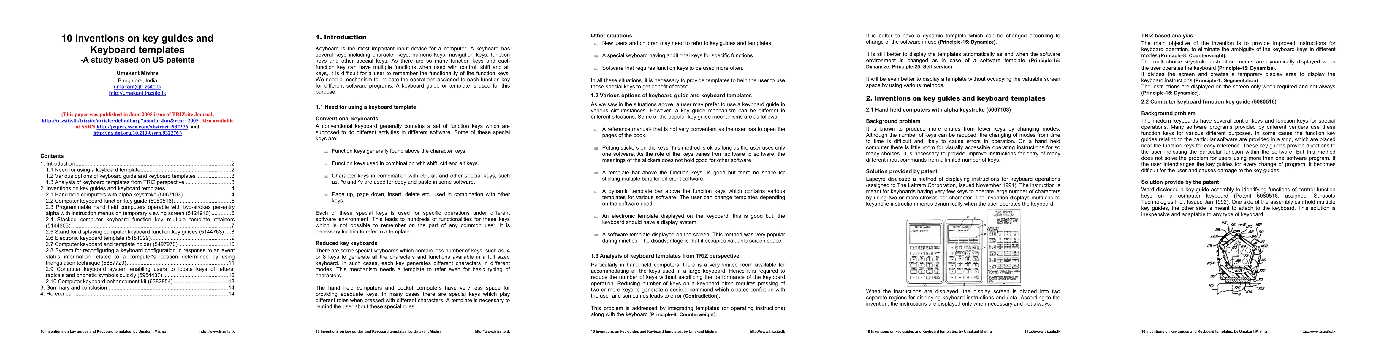 This paper explores 10 inventions from the US patent database that propose mechanisms for keyboard key guides and function key templates to help users remember the multiple functions of keys. These inventions include static, dynamic, manual, mechanical, and onscreen display templates.