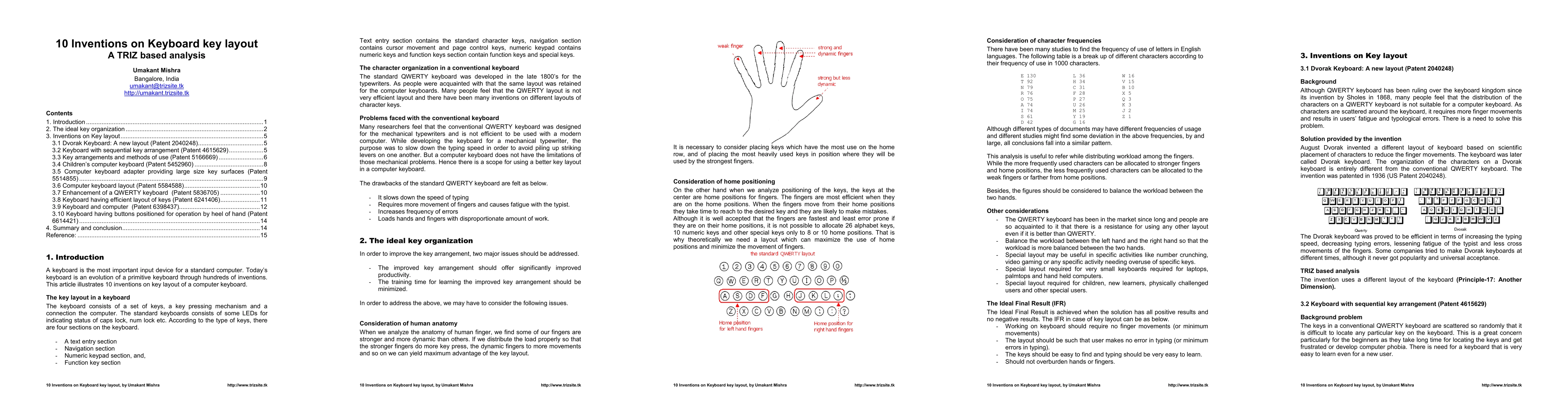 This paper analyzes 10 inventive keyboard layouts from the US patent database using TRIZ principles to improve productivity and minimize training time. The proposed layouts aim to reduce finger movements, enhance typing speed, minimize errors, and accommodate special needs.