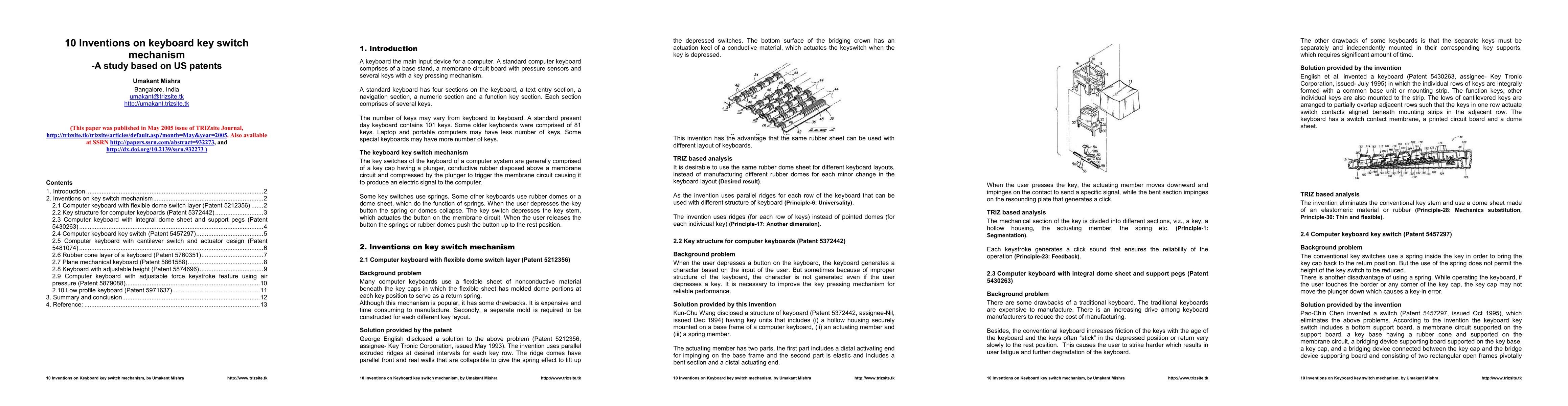 This paper reviews 10 patented inventions aimed at improving computer keyboard key switch mechanisms, focusing on simplifying design, reducing costs, and enhancing durability and reliability through various spring and dome-based technologies.