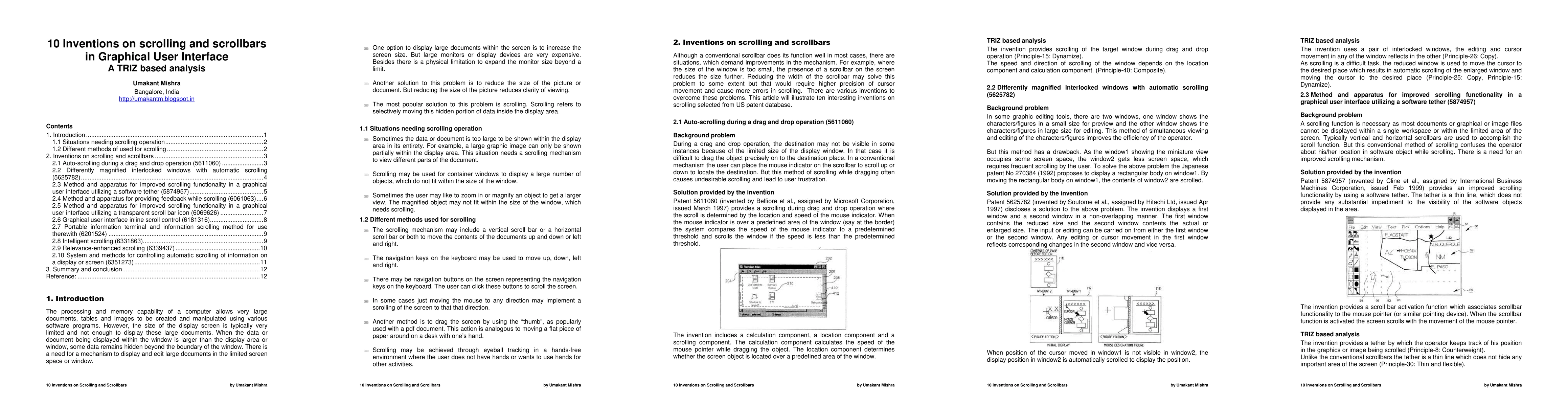 Scrolling mechanism is used to display and edit large documents in a limited screen space or window. The scrolling mechanism may include a vertical scroll bar or a horizontal scroll bar or both to move the contents of the documents up and down or left and right. There may be navigation buttons on the screen representing the navigation keys on the keyboard. The user can click these buttons to scroll the screen. There may be very different methods of scrolling such as by using the "thumb", as popularly used with a PDF document. Scrolling may be achieved through eyeball tracking in a hands-free environment where the user does not have hands or wants to use hands for other activities. This article illustrates ten interesting inventions on scrolling selected from US patent database.