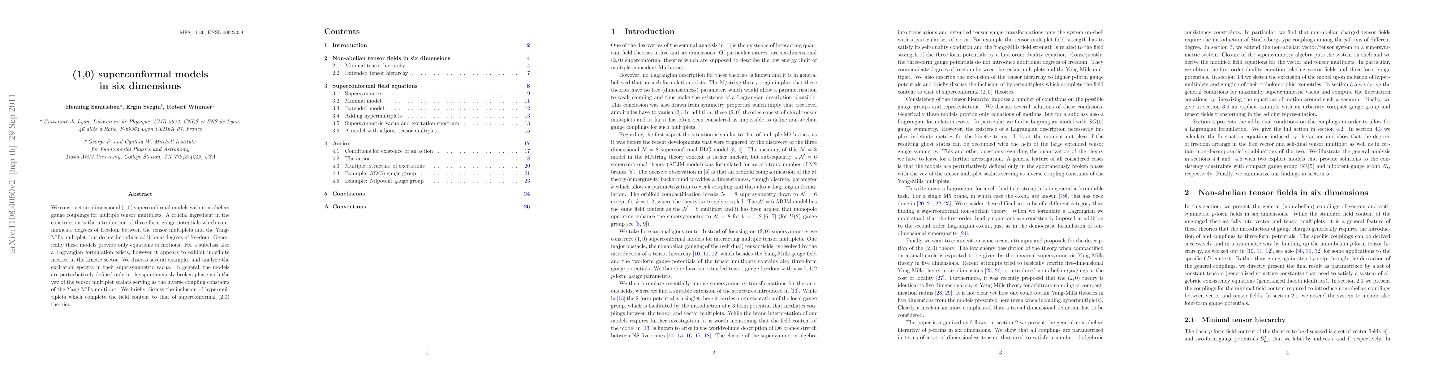 This paper constructs six-dimensional (1,0) superconformal models with non-abelian gauge fields and tensor multiplets, utilizing three-form gauge potentials to link these components without adding extra degrees of freedom. The models are perturbatively defined in the spontaneously broken phase, and hypermultiplets can be included to match superconformal (2,0) theories.