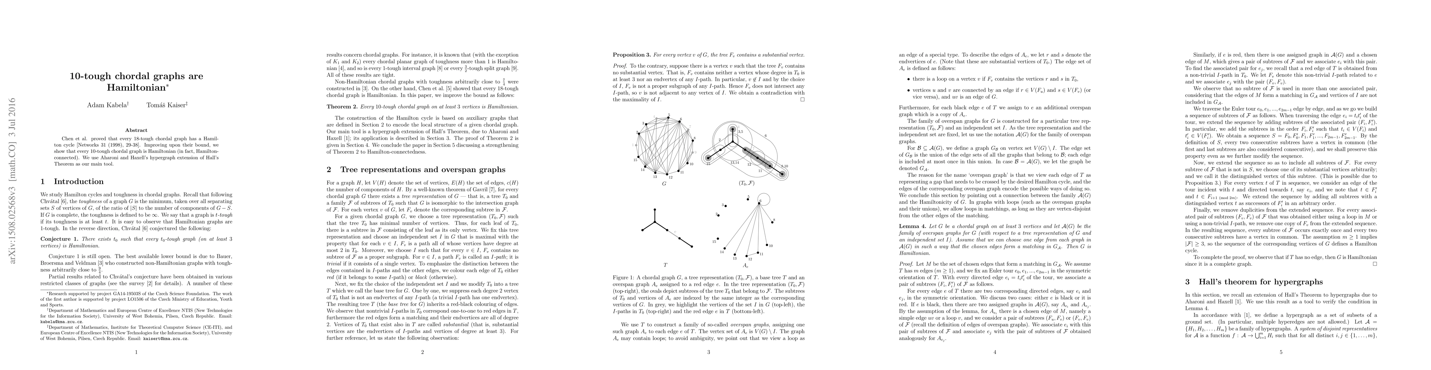 This paper demonstrates that every 10-tough chordal graph contains a Hamilton cycle, improving upon previous results that required the graph to be 18-tough. The authors utilize Aharoni and Haxell's hypergraph extension of Hall's Theorem to establish this stronger condition.