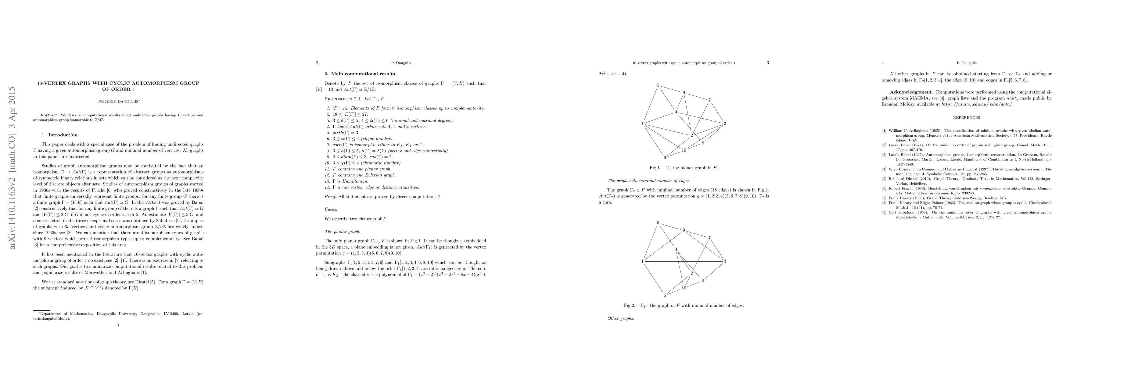 Summary: This paper presents computational findings on undirected graphs with 10 vertices and an automorphism group isomorphic to $\mathbb{Z}/4\mathbb{Z}$, detailing their structural properties and characteristics. The study focuses on identifying and analyzing these specific cyclic symmetry structures.