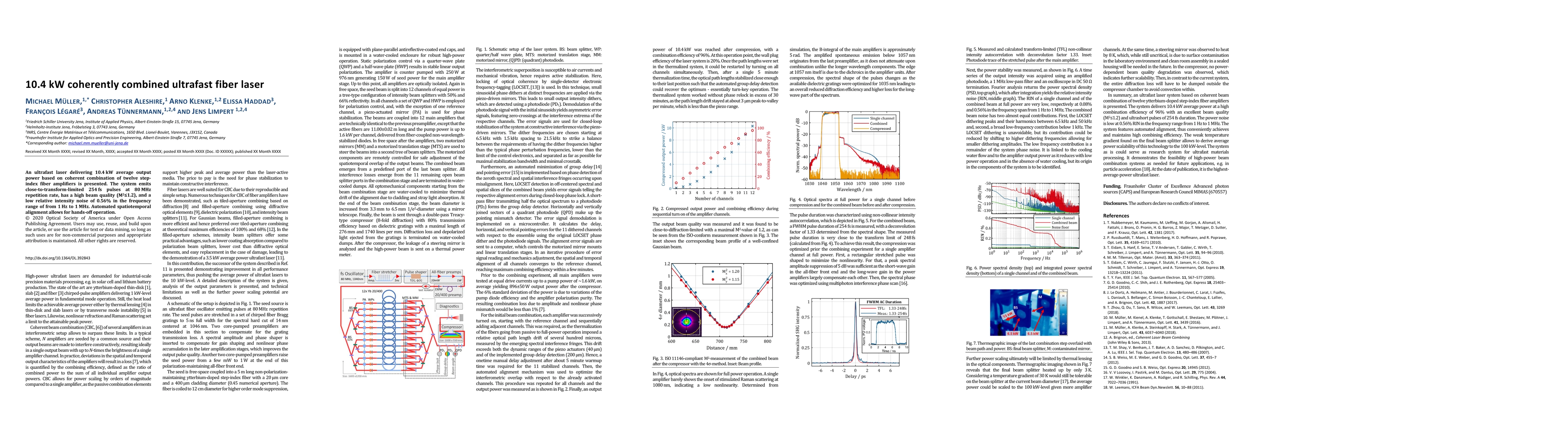 An ultrafast laser delivering 10.4 kW average output power based on coherent combination of twelve stepindex fiber amplifiers is presented. The system emits close-to-transform-limited 254 fs pulses at 80 MHz repetition rate, has a high beam quality (M2<=1.2), and a low relative intensity noise of 0.56% in the frequency range of from 1 Hz to 1 MHz. Automated spatiotemporal alignment allows for hands-off operation.