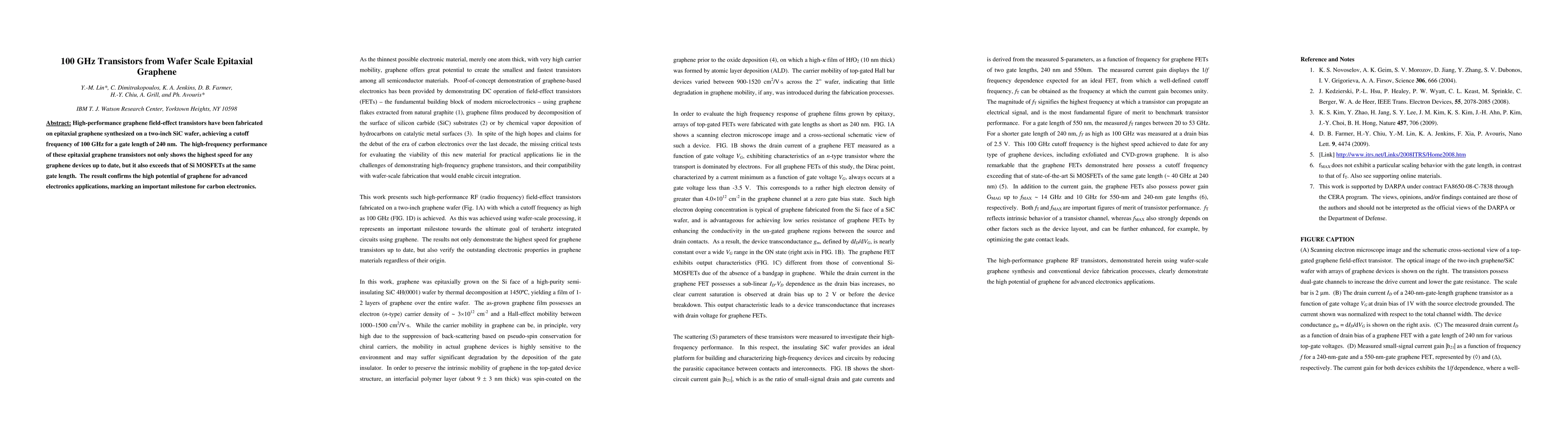 This paper reports the fabrication of high-performance graphene transistors on epitaxial graphene, achieving a 100 GHz cutoff frequency, surpassing the speed of Si MOSFETs at the same gate length, and highlighting graphene's potential for advanced electronic applications.