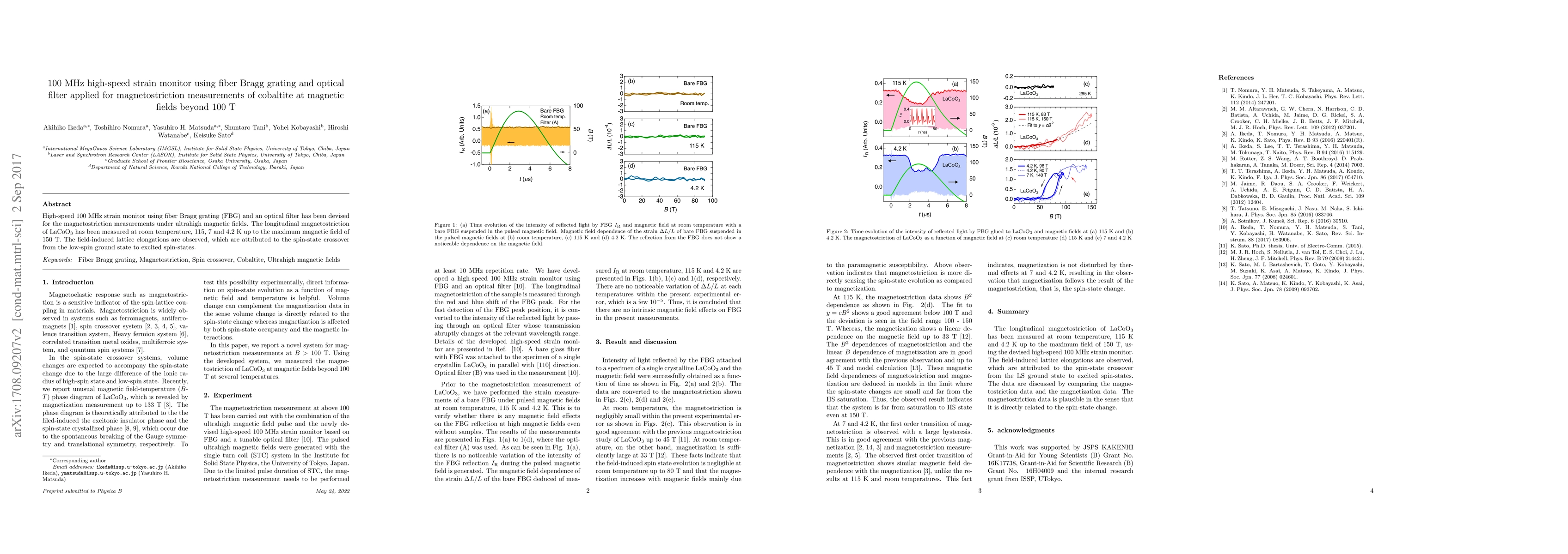 This paper presents a 100 MHz high-speed strain monitor utilizing fiber Bragg grating and an optical filter for magnetostriction measurements of LaCoO$_3$ under ultrahigh magnetic fields up to 150 T. The study observes field-induced lattice elongations linked to spin-state transitions in cobaltite at various temperatures.