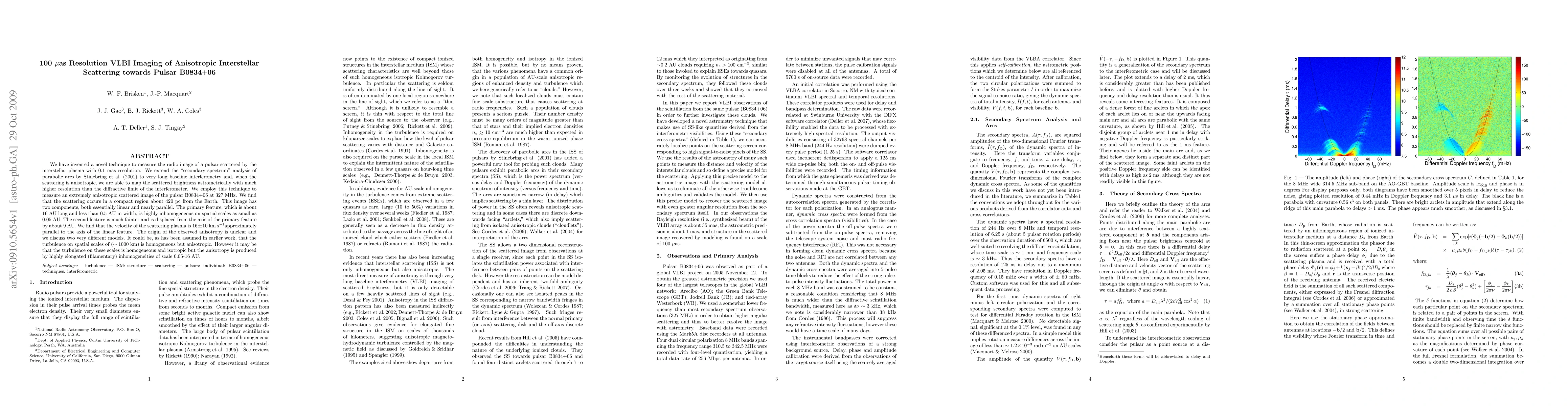 Researchers used a novel technique to image pulsar B0834+06 scattered by interstellar plasma with high resolution, revealing two linear features and an anisotropic scattering pattern that could be caused by either homogeneous turbulence or filamentary inhomogeneities.