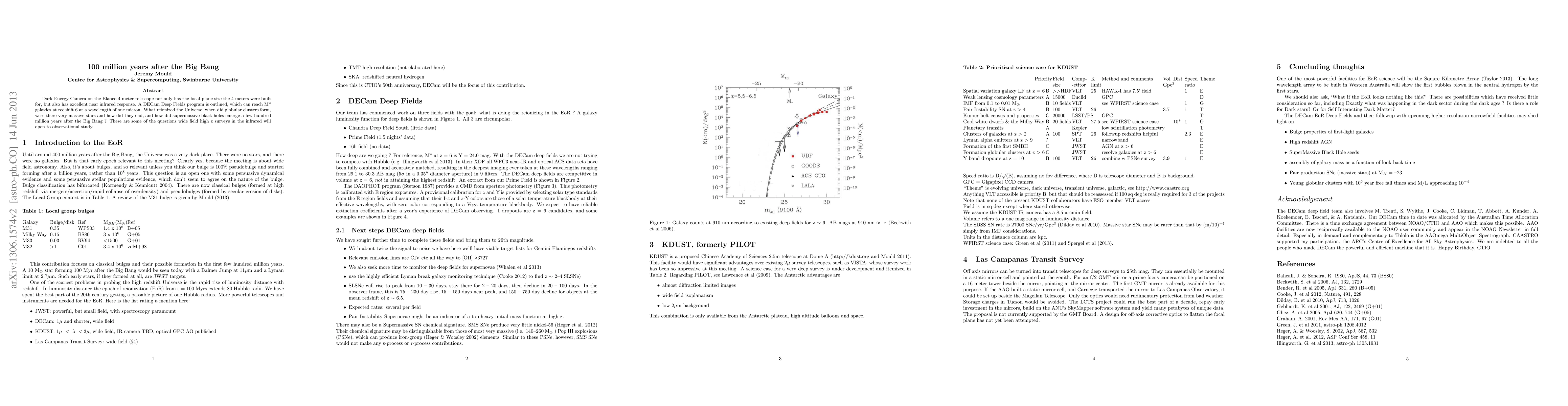 Dark Energy Camera on the Blanco 4 meter telescope not only has the focal plane size the 4 meters were built for, but also has excellent near infrared response. A DECam Deep Fields program is outlined, which can reach M* galaxies at redshift 6 at a wavelength of one micron. What reionized the Universe, when did globular clusters form, were there very massive stars and how did they end, and how did supermassive black holes emerge a few hundred million years after the Big Bang ? These are some of the questions wide field high z surveys in the infrared will open to observational study.