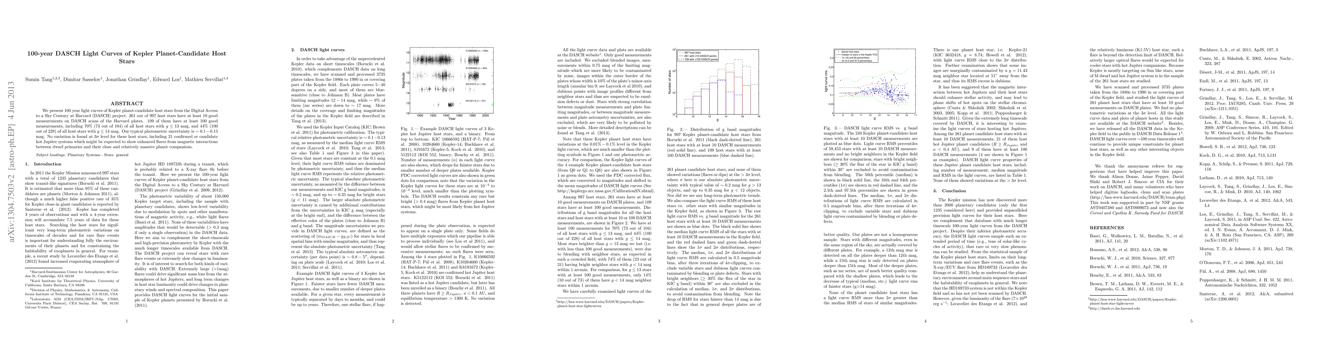 This paper presents 100-year light curves of Kepler planet-candidate host stars derived from the DASCH project, revealing no significant variations in brightness for 261 stars, including 109 with over 100 measurements, despite the expectation of enhanced flares in hot Jupiter systems. The study achieves a photometric uncertainty of ~0.1-0.15 mag.