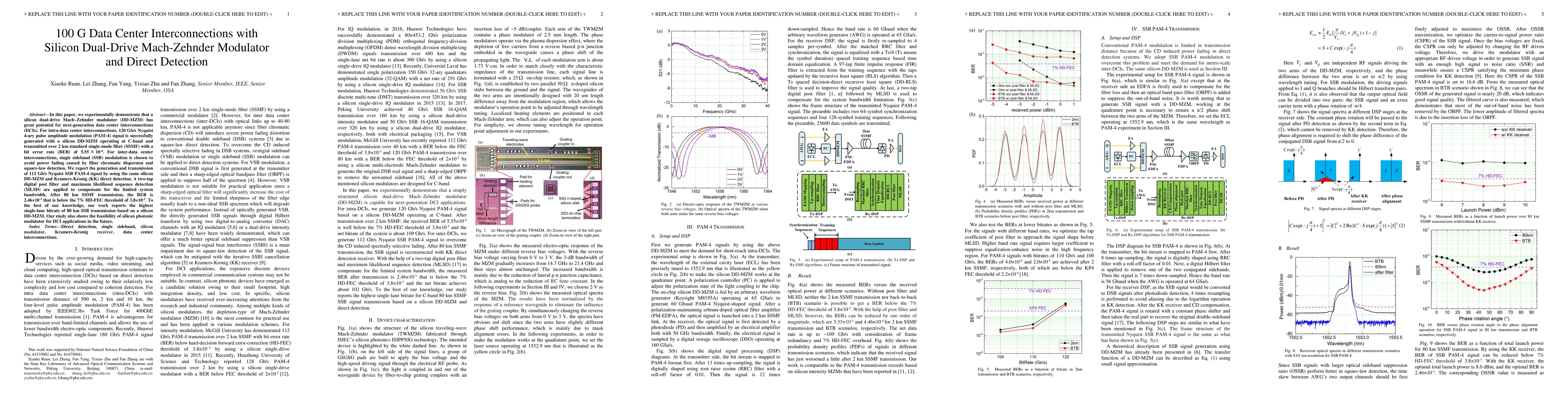 This paper demonstrates the successful implementation of a silicon dual-drive Mach-Zehnder modulator for 100G data center interconnections, achieving 120 Gb/s PAM-4 signal over 2 km and 112 Gb/s SSB PAM-4 over 80 km using direct detection and digital post-processing.