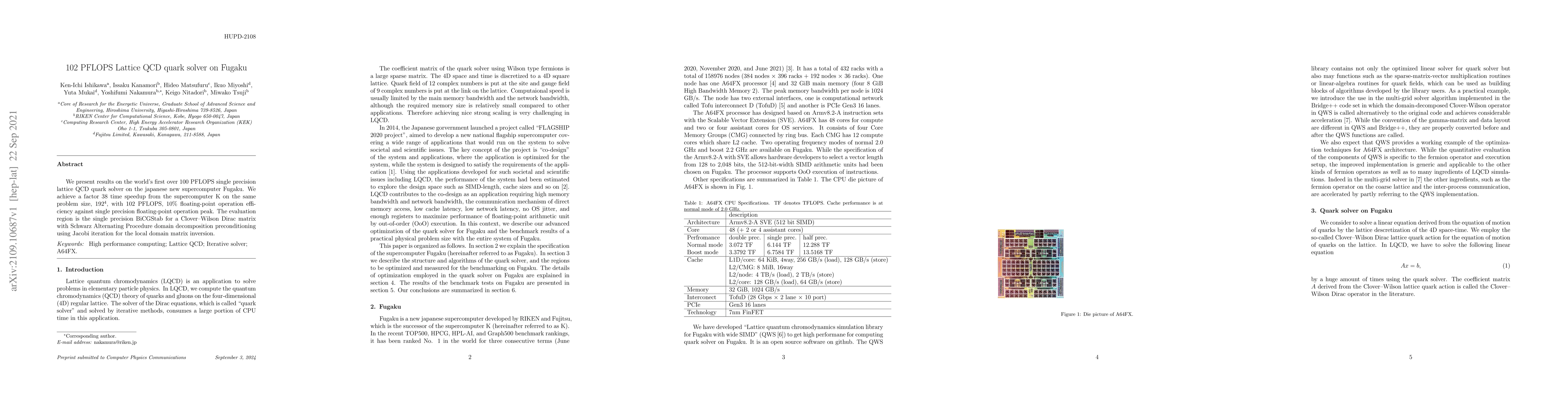 The paper presents an efficient single-precision lattice QCD quark solver on Fugaku, employing BiCGStab with domain decomposition preconditioning and SIMD vectorization optimizations.