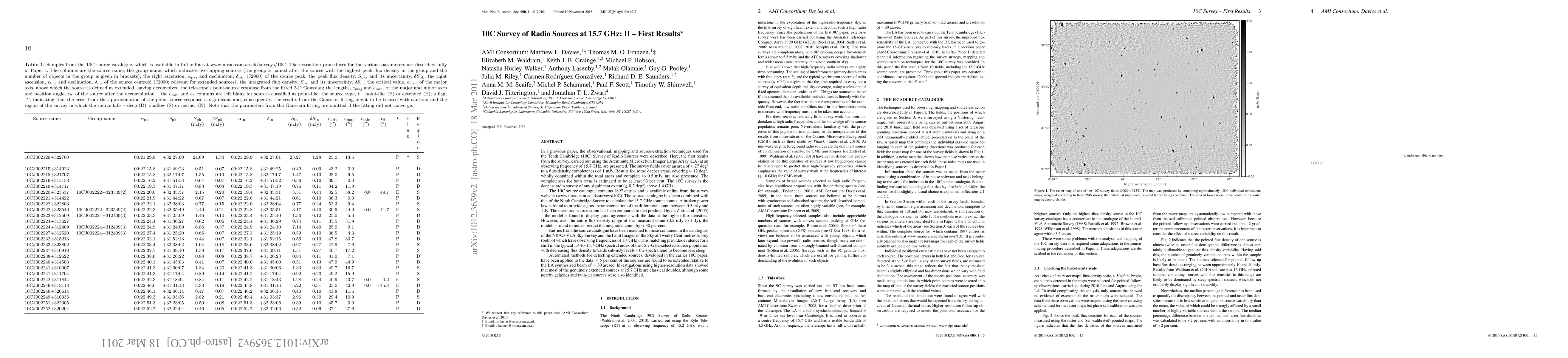 The 10C Survey of Radio Sources at 15.7 GHz presents a catalogue of 1897 entries, covering 27 sq. degrees with a completeness of 93%. The survey reveals a shift in spectral index towards less steep spectra at lower flux densities and identifies about 5% of sources as extended.