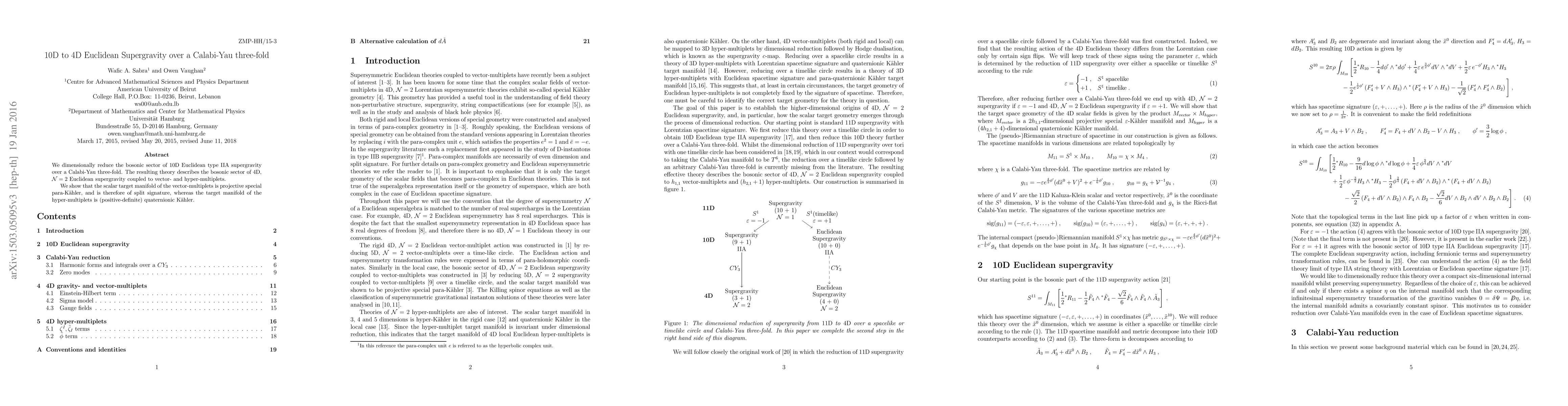 We dimensionally reduce the bosonic sector of 10D Euclidean type IIA supergravity over a Calabi-Yau three-fold. The resulting theory describes the bosonic sector of 4D, N = 2 Euclidean supergravity coupled to vector- and hyper-multiplets. We show that the scalar target manifold of the vector-multiplets is projective special para-Kahler, and is therefore of split signature, whereas the target manifold of the hyper-multiplets is (positive-definite) quaternionic Kahler.