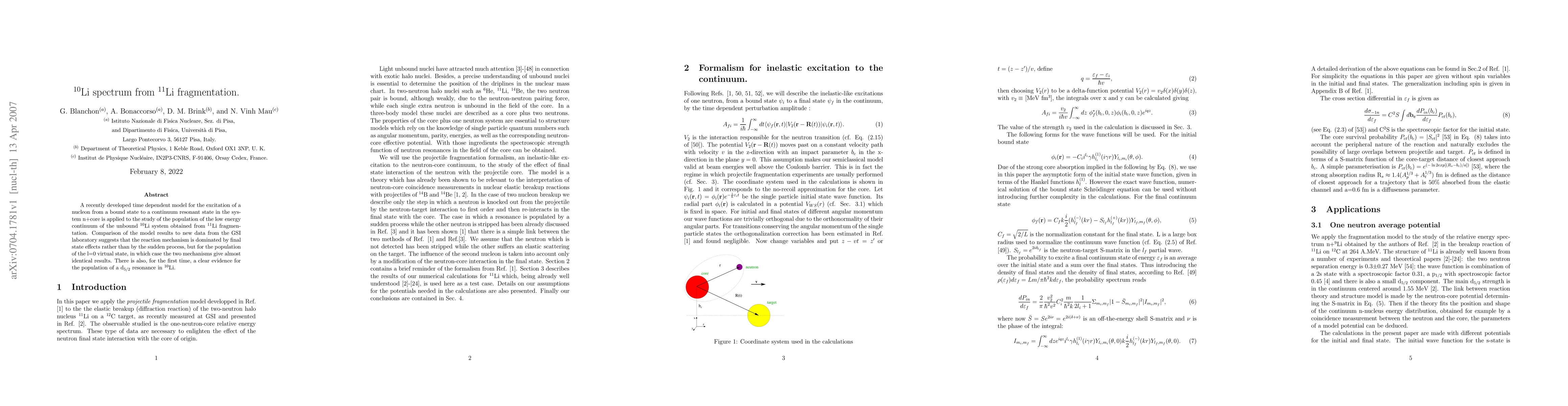 A recently developed time dependent model for the excitation of a nucleon from a bound state to a continuum resonant state in the system n+core is applied to the study of the population of the low energy continuum of the unbound $^{10}$Li system obtained from $^{11}$Li fragmentation. Comparison of the model results to new data from the GSI laboratory suggests that the reaction mechanism is dominated by final state effects rather than by the sudden process, but for the population of the l=0 virtual state, in which case the two mechanisms give almost identical results. There is also, for the first time, a clear evidence for the population of a d$_{5/2}$ resonance in $^{10}$Li.