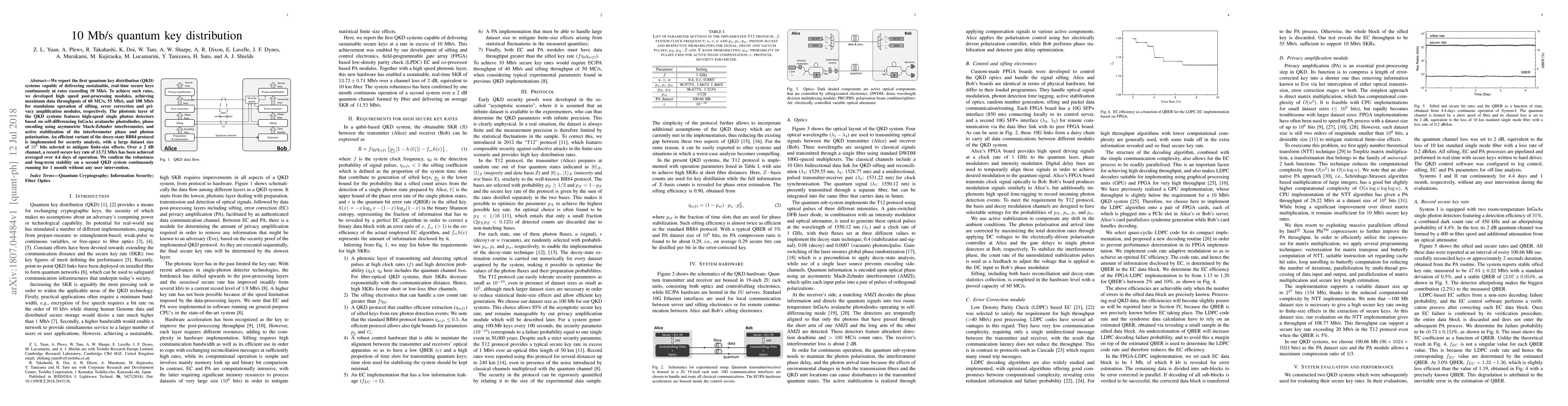 Researchers have achieved sustainable real-time secure keys at rates exceeding 10 Mb/s using high-speed post-processing modules and advanced photonic layer technology. A record secure key rate of 13.72 Mb/s was also set over a 2 dB channel in continuous operation for up to 4.4 days.