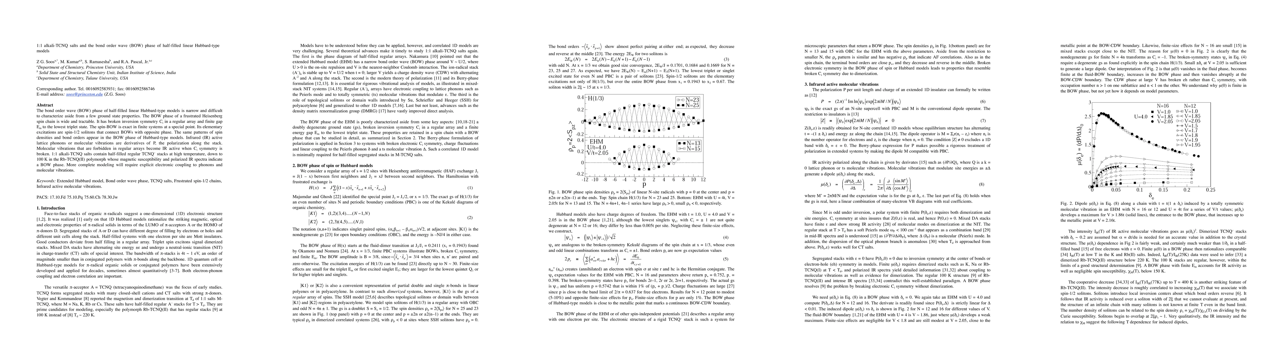 The bond order wave (BOW) phase of half-filled linear Hubbard-type models is narrow and difficult to characterize aside from a few ground state properties. The BOW phase of a frustrated Heisenberg spin chain is wide and tractable. It has broken inversion symmetry C_i in a regular array and finite gap E_m to the lowest triplet state. The spin-BOW is exact in finite systems at a special point. Its elementary excitations are spin-1/2 solitons that connect BOWs with opposite phase. The same patterns of spin densities and bond orders appear in the BOW phase of Hubbard-type models. Infrared (IR) active lattice phonons or molecular vibrations are derivatives of P, the polarization along the stack. Molecular vibrations that are forbidden in regular arrays become IR active when C_i symmetry is broken. 1:1 alkali-TCNQ salts contain half-filled regular TCNQ- stacks at high temperature, down to 100 K in the Rb-TCNQ(II) polymorph whose magnetic susceptibility and polarized IR spectra indicate a BOW phase. More complete modeling will require explicit electronic coupling to phonons and molecular vibrations.