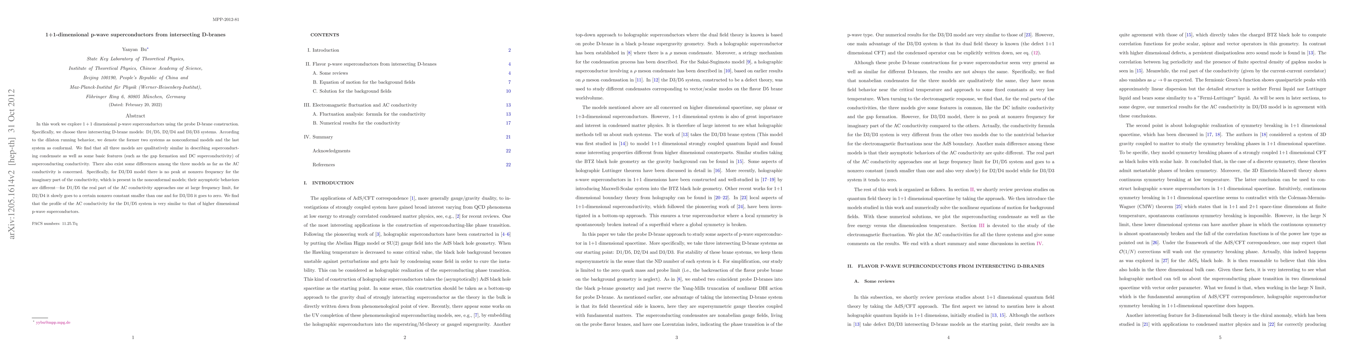 In this work we explore 1+1 dimensional p-wave superconductors using the probe D-brane construction. Specifically, we choose three intersecting D-brane models: D1/D5, D2/D4 and D3/D3 systems. According to the dilaton running behavior, we denote the former two systems as nonconformal models and the last system as conformal. We find that all three models are qualitatively similar in describing superconducting condensate as well as some basic features (such as the gap formation and DC superconductivity) of superconducting conductivity. There also exist some differences among the three models as far as the AC conductivity is concerned. Specifically, for D3/D3 model there is no peak at nonzero frequency for the imaginary part of the conductivity, which is present in the nonconformal models; their asymptotic behaviors are different-for D1/D5 the real part of the AC conductivity approaches one at large frequency limit, for D2/D4 it slowly goes to a certain nonzero constant smaller than one and for D3/D3 it goes to zero. We find the profile of the AC conductivity for the D1/D5 system is very similar to that of higher dimensional p-wave superconductors.
