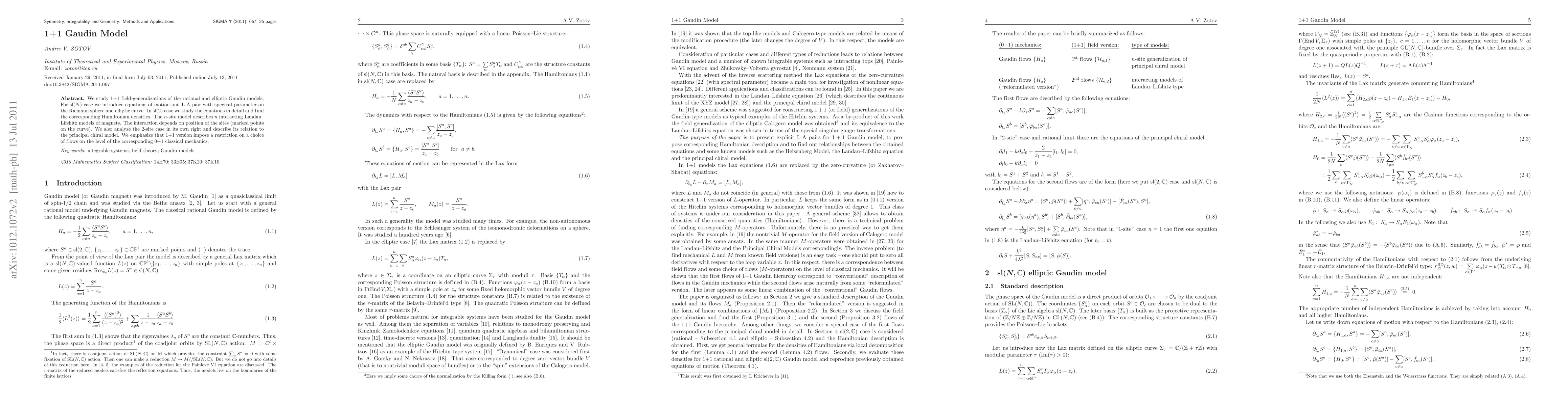 We study 1+1 field-generalizations of the rational and elliptic Gaudin models. For ${\rm sl}(N)$ case we introduce equations of motion and L-A pair with spectral parameter on the Riemann sphere and elliptic curve. In ${\rm sl}(2)$ case we study the equations in detail and find the corresponding Hamiltonian densities. The $n$-site model describes $n$ interacting Landau-Lifshitz models of magnets. The interaction depends on position of the sites (marked points on the curve). We also analyze the 2-site case in its own right and describe its relation to the principal chiral model. We emphasize that 1+1 version impose a restriction on a choice of flows on the level of the corresponding 0+1 classical mechanics.