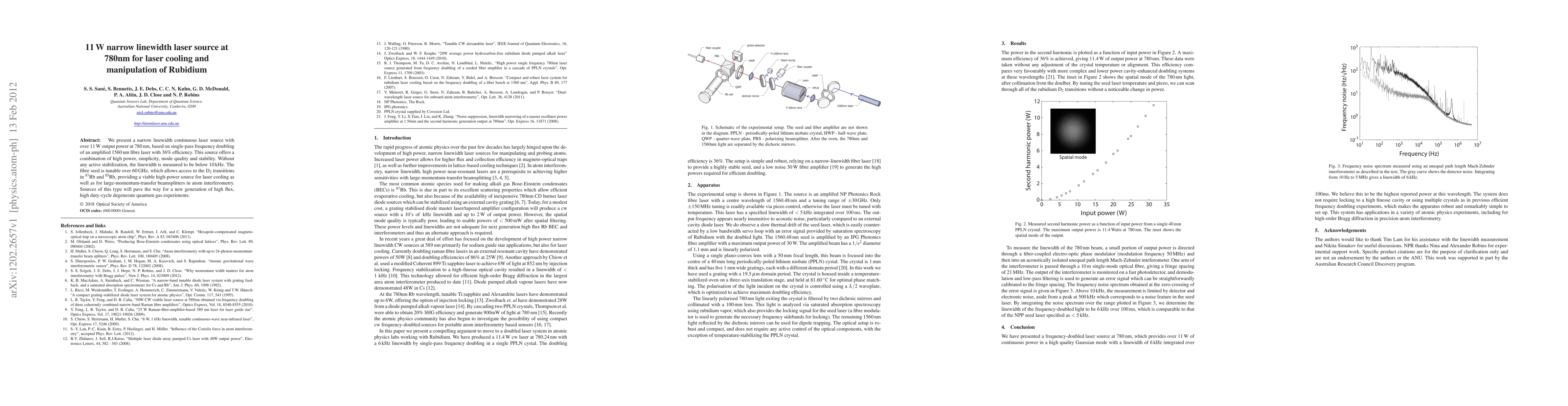 This paper presents an 11 W narrow linewidth laser source at 780nm, achieved via frequency doubling of a 1560nm fiber laser, offering high power and stability with a linewidth below 10kHz. It is suitable for laser cooling and atom interferometry in Rubidium experiments.