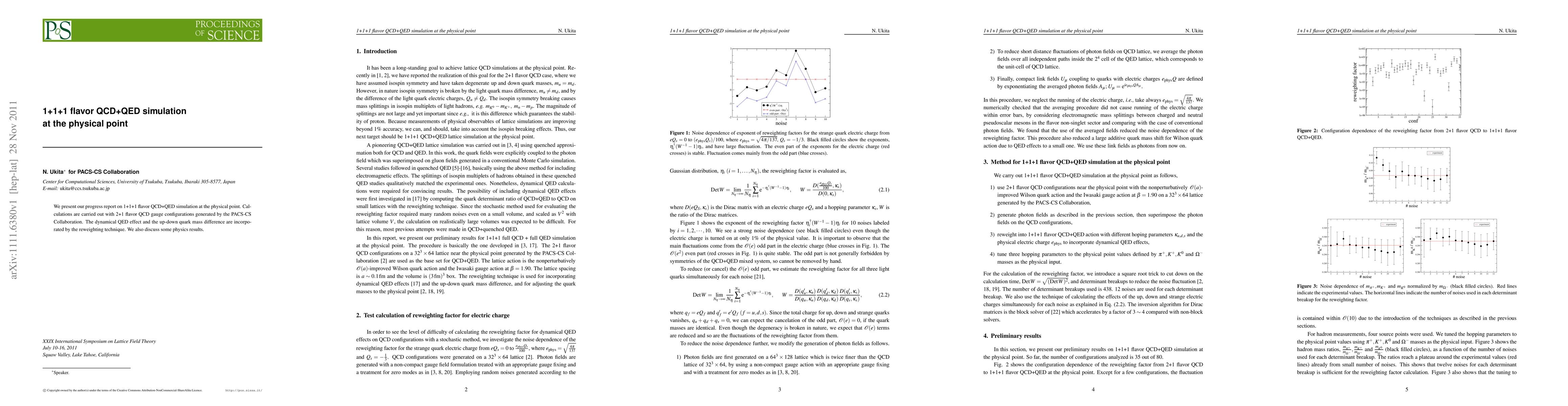 We present our progress report on 1+1+1 flavor QCD+QED simulation at the physical point. Calculations are carried out with 2+1 flavor QCD gauge configurations generated by the PACS-CS Collaboration. The dynamical QED effect and the up-down quark mass difference are incorporated by the reweighting technique. We also discuss some physics results.