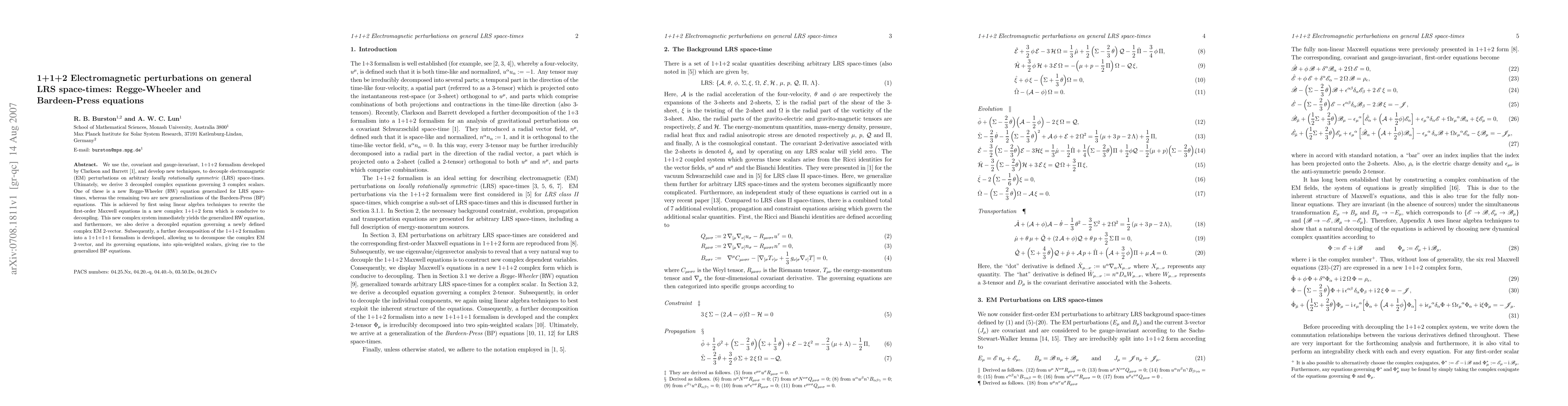 This paper develops new techniques to decouple electromagnetic perturbations on locally rotationally symmetric space-times using a 1+1+2 formalism, resulting in three decoupled complex equations: a generalized Regge-Wheeler equation and two new Bardeen-Press equations. The approach involves rewriting Maxwell's equations in a complex 1+1+2 form for decoupling.