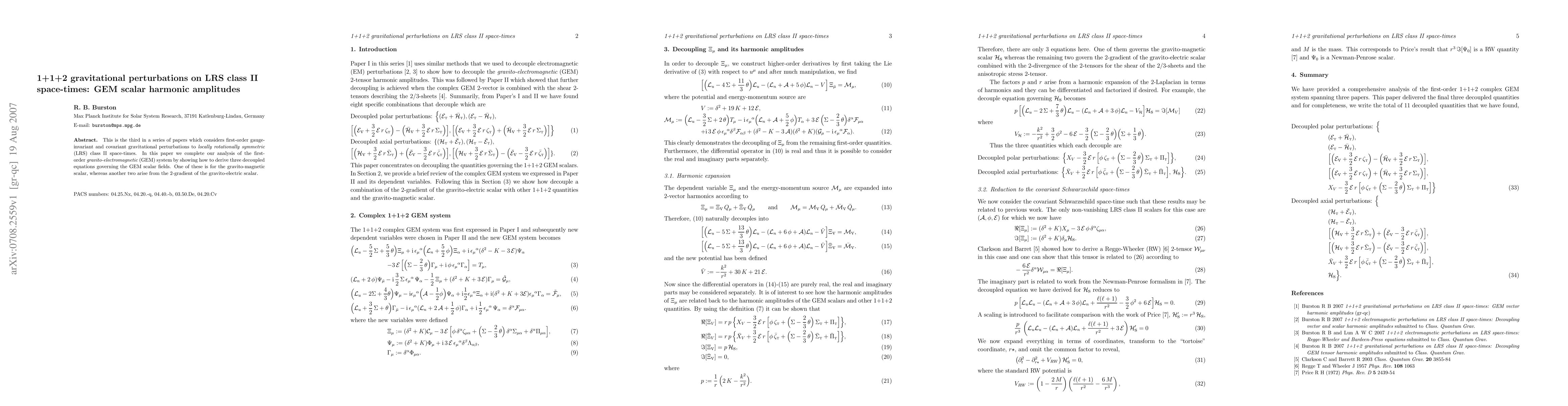 This paper completes the analysis of first-order gravitational perturbations on LRS class II space-times, deriving three decoupled equations for the gravito-electromagnetic (GEM) scalar fields, including one for the gravito-magnetic scalar and two from the 2-gradient of the gravito-electric scalar.