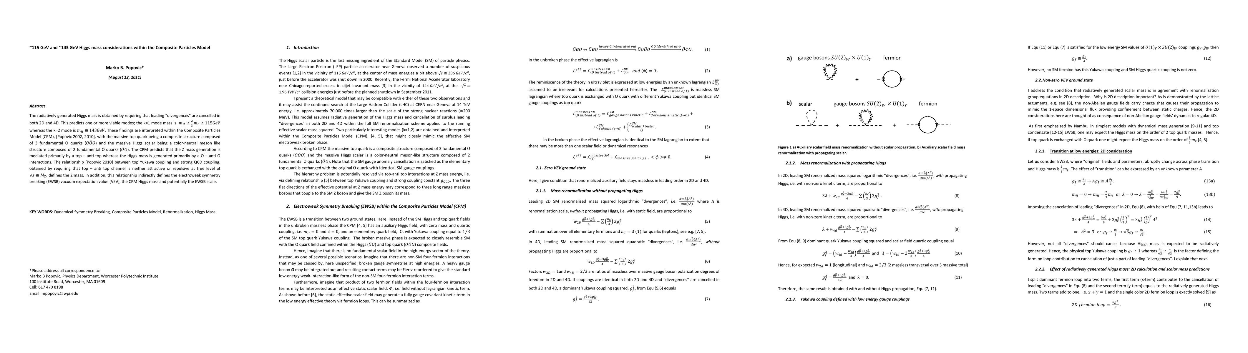 The radiatively generated Higgs mass is obtained by requiring that leading "divergences" are cancelled in both 2D and 4D. This predicts one or more viable modes; the k=1 mode mass is m_H\cong2/3 m_t\cong115GeV whereas the k=2 mode is m_H\cong143GeV. These findings are interpreted within the Composite Particles Model (CPM), [Popovic 2002, 2010], with the massive top quark being a composite structure composed of 3 fundamental O quarks (O\bar{O}O) and the massive Higgs scalar being a color-neutral meson like structure composed of 2 fundamental O quarks (\bar{O}O). The CPM predicts that the Z mass generation is mediated primarily by a top - anti top whereas the Higgs mass is generated primarily by a O - anti O interactions. The relationship [Popovic 2010] between top Yukawa coupling and strong QCD coupling, obtained by requiring that top - anti top channel is neither attractive or repulsive at tree level at \surd s\congM_Z, defines the Z mass. In addition, this relationship indirectly defines the electroweak symmetry breaking (EWSB) vacuum expectation value (VEV), the CPM Higgs mass and potentially the EWSB scale.
