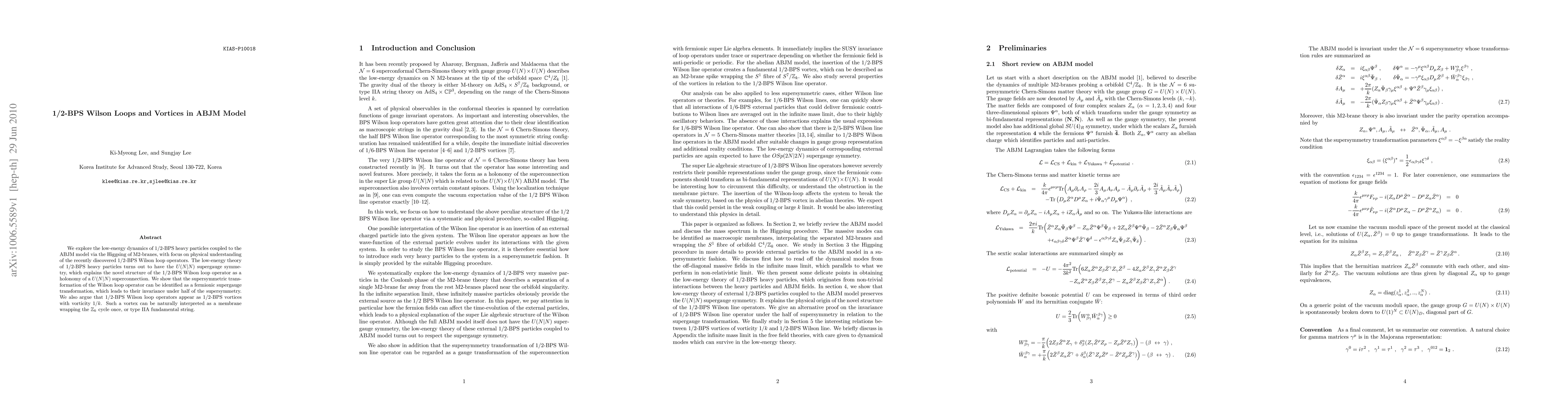This paper investigates the dynamics of 1/2-BPS heavy particles in the ABJM model, discovering that 1/2-BPS Wilson loop operators are invariant under half of the supersymmetry and can be interpreted as 1/2-BPS vortices with vorticity 1/k. The study reveals that these vortices can be seen as membranes wrapping a Z_k cycle or fundamental strings.