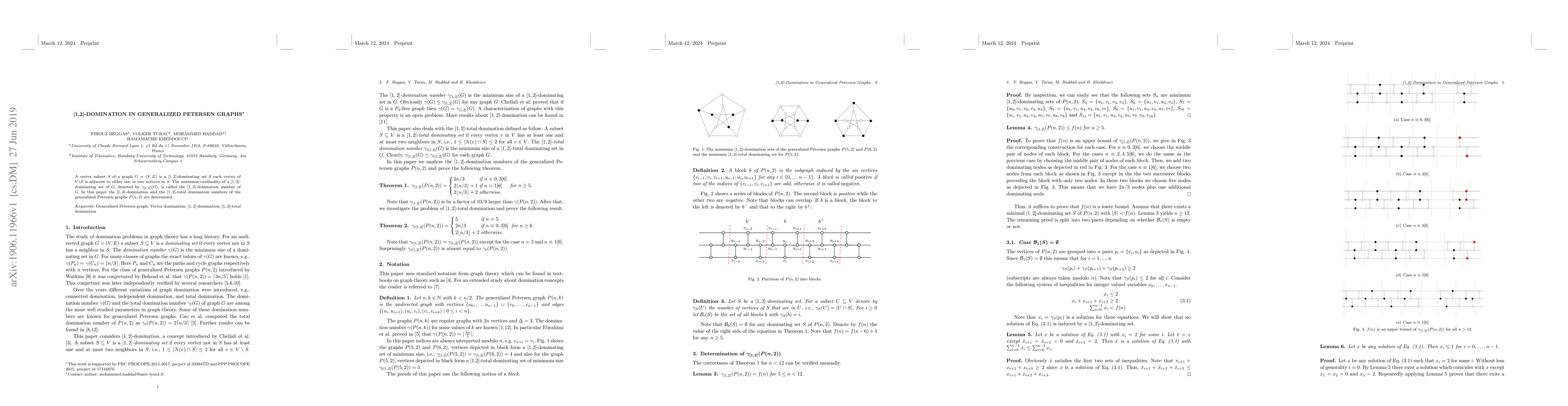 This paper determines the $[1,2]$-domination number, $\gamma_{[1,2]}(G)$, and the $[1,2]$-total domination number for generalized Petersen graphs $P(n,2)$. A $[1,2]$-dominating set ensures each vertex not in the set is adjacent to either one or two vertices in the set.