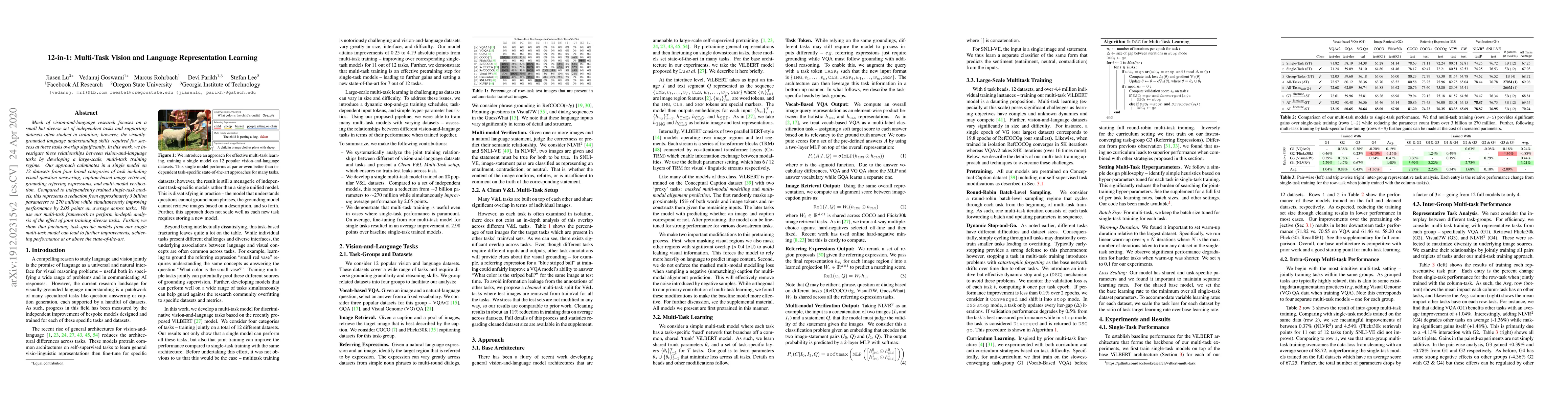 This paper develops a multi-task model that learns representations for vision and language across 12 diverse datasets, achieving significant parameter efficiency and performance improvements compared to single-task models. Finetuning from the multi-task model further enhances task-specific performance.