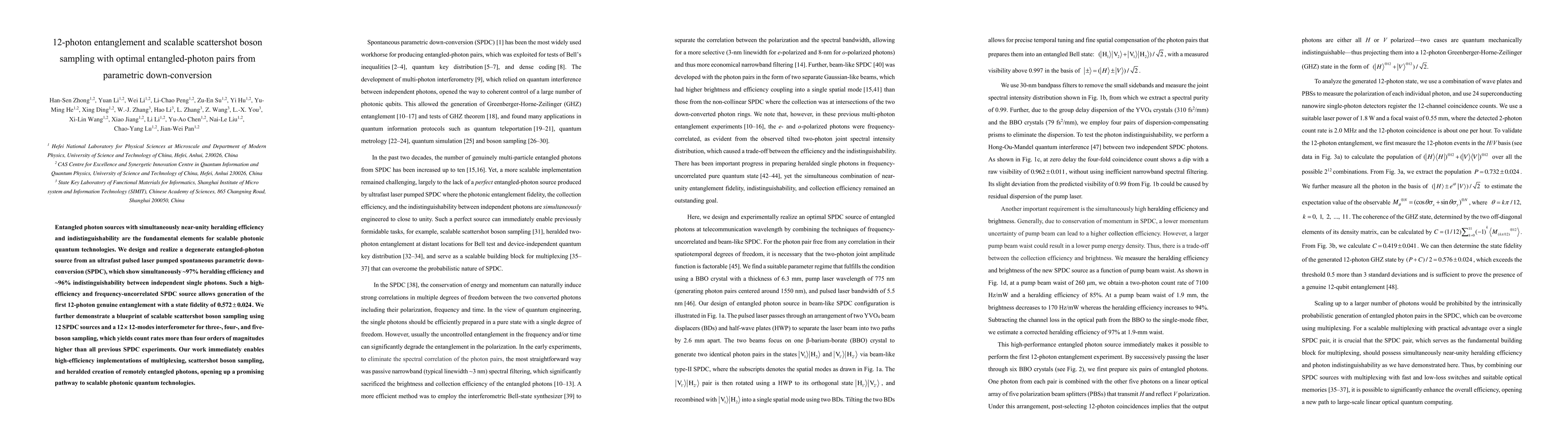This paper presents a highly efficient entangled photon source from parametric down-conversion, achieving near-unity heralding efficiency and indistinguishability. It demonstrates 12-photon entanglement and scalable scattershot boson sampling, significantly improving count rates and paving the way for scalable photonic quantum technologies.