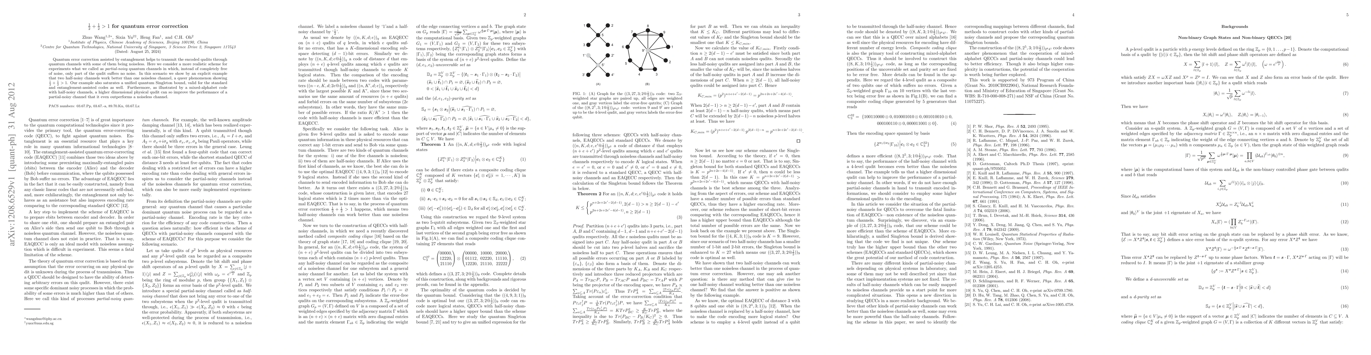 Quantum error correction assisted by entanglement helps to transmit the encoded qudits through quantum channels with some of them being noiseless. Here we consider a more realistic scheme for experiments what we called as partial-noisy quantum channels in which, instead of completely free of noise, only part of the qudit suffers no noise. In this scenario we show by an explicit example that two half-noisy channels work better than one noiseless channel, a queer phenomenon showing 1/2+1/2>1. Our example also saturates a unified quantum Singleton bound, valid for the standard and entanglement-assisted codes as well. Furthermore, as illustrated by a mixed-alphabet code with half-noisy channels, a higher dimensional physical qudit can so improve the performance of a partial-noisy channel that it even outperforms a noiseless channel.