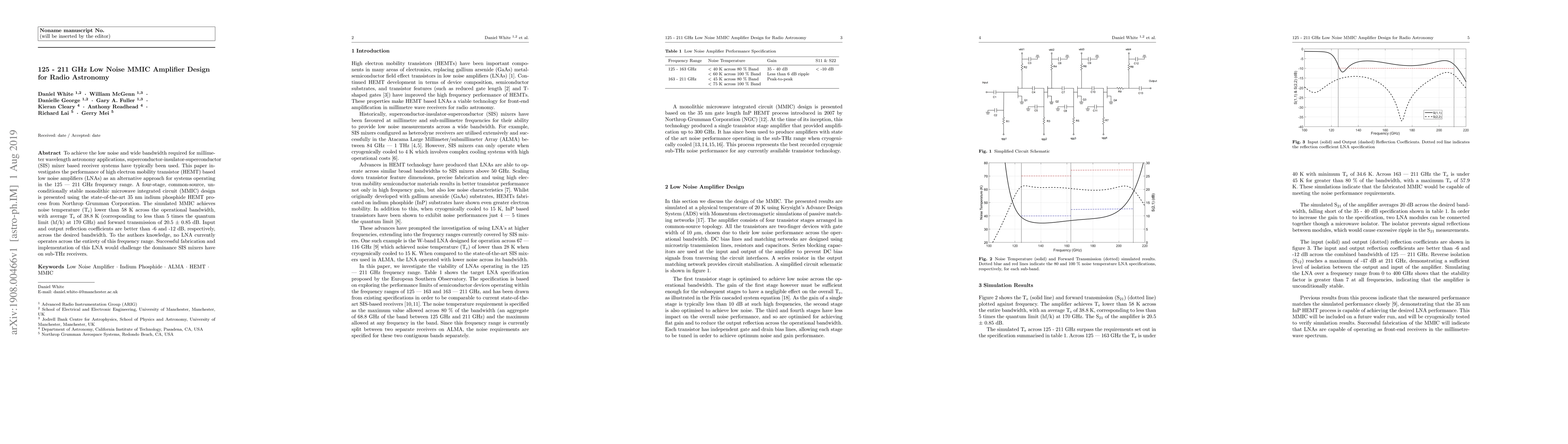 To achieve the low noise and wide bandwidth required for millimeter wavelength astronomy applications, superconductor-insulator-superconductor (SIS) mixer based receiver systems have typically been used. This paper investigates the performance of high electron mobility transistor (HEMT) based low noise amplifiers (LNAs) as an alternative approach for systems operating in the 125 - 211 GHz frequency range. A four-stage, common-source, unconditionally stable monolithic microwave integrated circuit (MMIC) design is presented using the state-of-the-art 35 nm indium phosphide HEMT process from Northrop Grumman Corporation. The simulated MMIC achieves noise temperature (Te) lower than 58 K across the operational bandwidth, with average Te of 38.8 K (corresponding to less than 5 times the quantum limit (hf/k) at 170 GHz) and forward transmission of 20.5 +/- 0.85 dB. Input and output reflection coefficients are better than -6 and -12 dB, respectively, across the desired bandwidth. To the authors knowledge, no LNA currently operates across the entirety of this frequency range. Successful fabrication and implementation of this LNA would challenge the dominance SIS mixers have on sub-THz receivers.