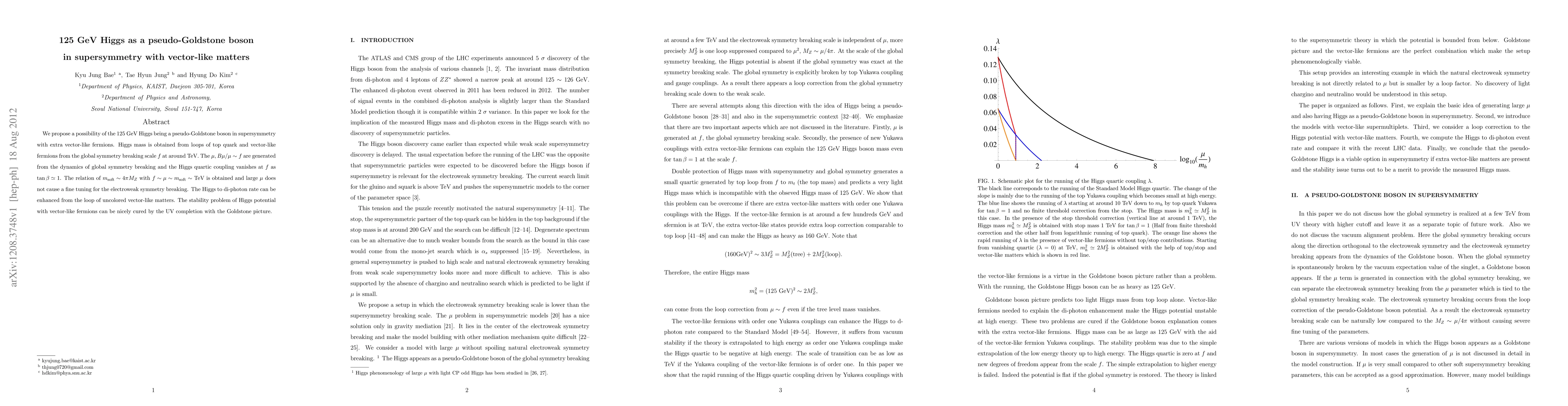 We propose a possibility of the 125 GeV Higgs being a pseudo-Goldstone boson in supersymmetry with extra vector-like fermions. Higgs mass is obtained from loops of top quark and vector-like fermions from the global symmetry breaking scale f at around TeV. The mu, Bmu/mu \sim f are generated from the dynamics of global symmetry breaking and the Higgs quartic coupling vanishes at f as tan beta \simeq 1. The relation of msoft \sim $4\pi M_Z$ with f \sim mu \sim m_soft \sim TeV is obtained and large mu does not cause a fine tuning for the electroweak symmetry breaking. The Higgs to di-photon rate can be enhanced from the loop of uncolored vector-like matters. The stability problem of Higgs potential with vector-like fermions can be nicely cured by the UV completion with the Goldstone picture.