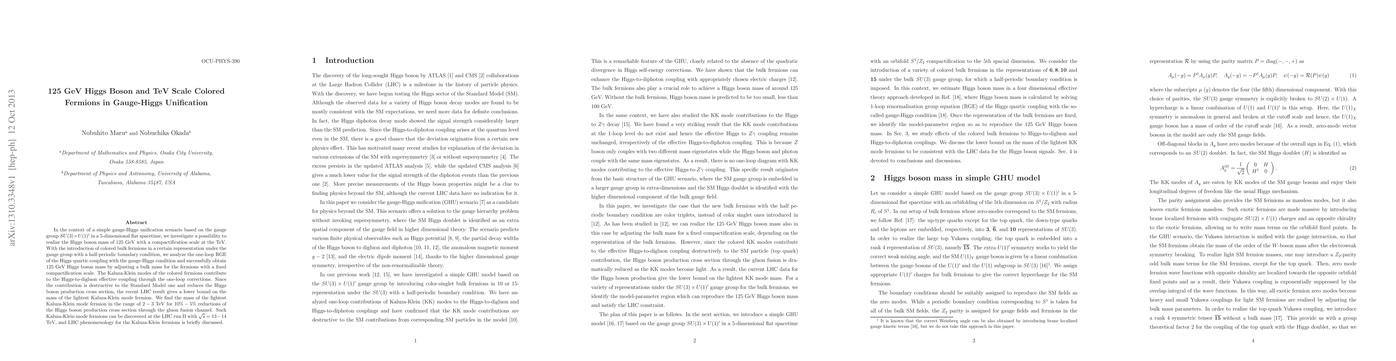 This paper explores a gauge-Higgs unification scenario in 5D SU(3)×U(1)' to achieve a 125 GeV Higgs boson mass with a TeV compactification scale, using colored fermions. The study finds that the lightest Kaluza-Klein mode fermion mass ranges from 2-3 TeV, potentially observable at the LHC run II.