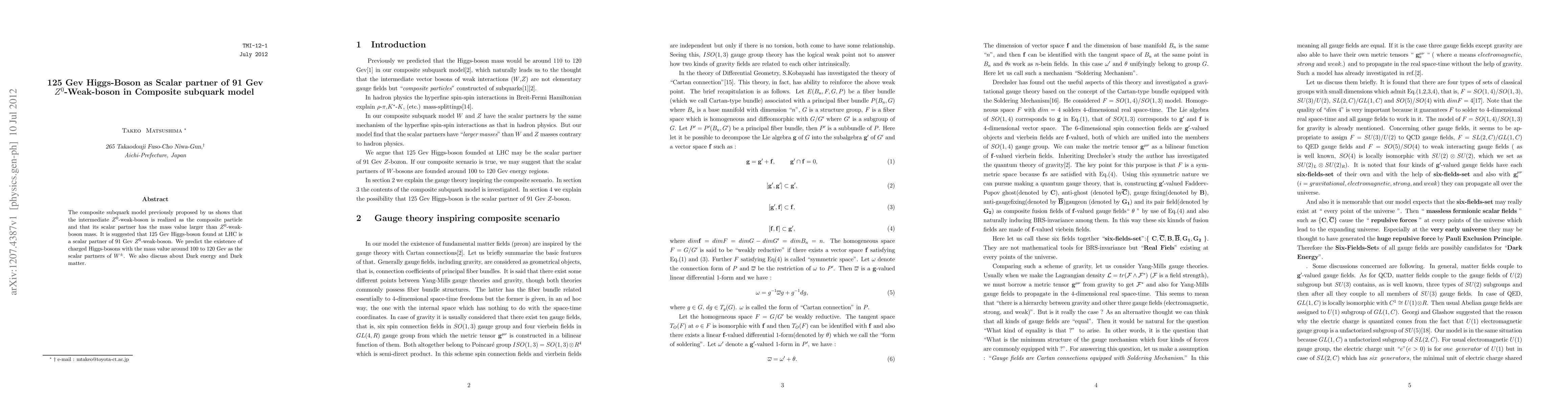 The composite subquark model previously proposed by us shows that the intermediate $Z^{0}$-weak-boson is realized as the composite particle and that its scalar partner has the mass value larger than $Z^{0}$-weak-boson mass. It is suggested that 125 Gev Higgs-boson found at LHC is a scalar partner of 91 Gev $Z^{0}$-weak-boson. We predict the existence of charged Higgs-bosons with the mass value around 100 to 120 Gev as the scalar partners of $W^{\pm}$. We also discuss about Dark energy and Dark matter.