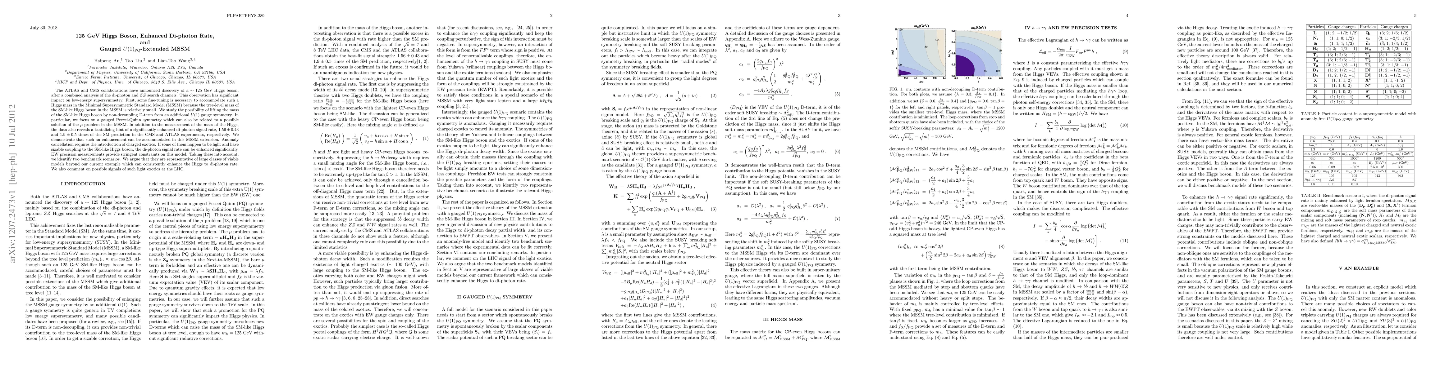This paper explores the implications of a 125 GeV Higgs boson discovered by ATLAS and CMS, focusing on an extended MSSM with gauged U(1)_PQ symmetry to address the mass discrepancy and the enhanced di-photon rate. It proposes viable scenarios where light exotic particles enhance the Higgs to di-photon signal, constrained by EW precision measurements and potential LHC signals.