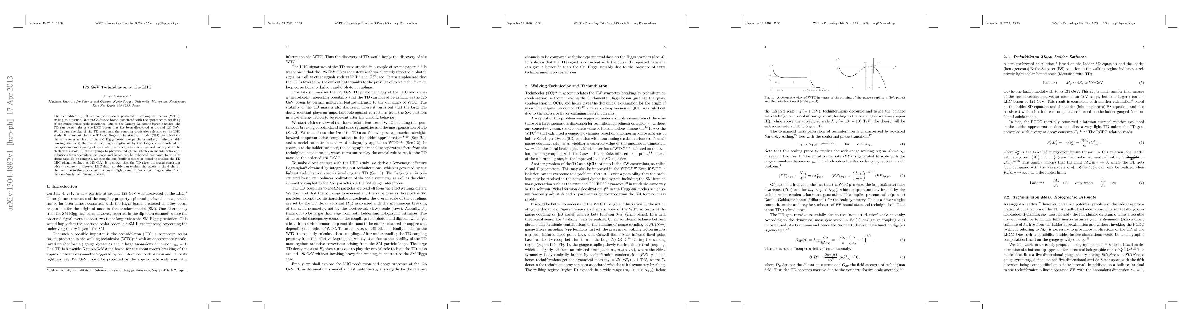 The technidilaton (TD) is a composite scalar predicted in walking technicolor (WTC), arising as a pseudo Nambu-Goldstone boson associated with the spontaneous breaking of the approximate scale invariance. Due to the Nambu-Goldstone boson's nature, the TD can be as light as the LHC boson that has been discovered at around 125 GeV. We discuss the size of the TD mass and the coupling properties relevant to the LHC study. It turns out that the TD couplings to the standard model (SM) particles take the same form as those of the SM Higgs boson, except the essentially distinguishable two ingredients: i) the overall coupling strengths set by the decay constant related to the spontaneous breaking of the scale invariance, which is in general not equal to the electroweak scale; ii) the couplings to photons and gluons which can include extra contributions from technifermion loops and hence can be enhanced compared to the SM Higgs case. To be concrete, we take the one-family technicolor model to explore the TD LHC phenomenology at 125 GeV. It is shown that the TD gives the signal consistent with the currently reported LHC data, notably can explain the excess in the diphoton channel, due to the extra contributions to digluon and diphoton couplings coming from the one-family technifermion loops.