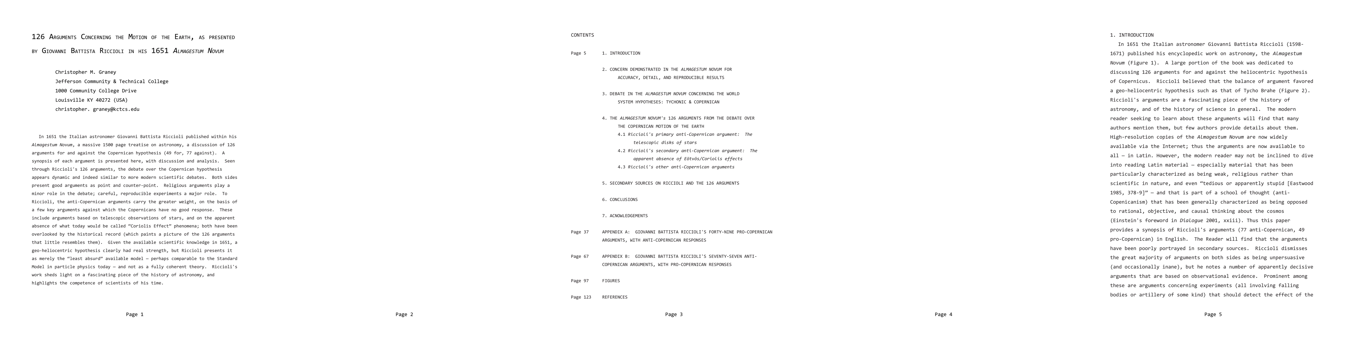 In 1651 the Italian astronomer Giovanni Battista Riccioli published within his Almagestum Novum, a massive 1500 page treatise on astronomy, a discussion of 126 arguments for and against the Copernican hypothesis (49 for, 77 against). A synopsis of each argument is presented here, with discussion and analysis. Seen through Riccioli's 126 arguments, the debate over the Copernican hypothesis appears dynamic and indeed similar to more modern scientific debates. Both sides present good arguments as point and counter-point. Religious arguments play a minor role in the debate; careful, reproducible experiments a major role. To Riccioli, the anti-Copernican arguments carry the greater weight, on the basis of a few key arguments against which the Copernicans have no good response. These include arguments based on telescopic observations of stars, and on the apparent absence of what today would be called "Coriolis Effect" phenomena; both have been overlooked by the historical record (which paints a picture of the 126 arguments that little resembles them). Given the available scientific knowledge in 1651, a geo-heliocentric hypothesis clearly had real strength, but Riccioli presents it as merely the "least absurd" available model - perhaps comparable to the Standard Model in particle physics today - and not as a fully coherent theory. Riccioli's work sheds light on a fascinating piece of the history of astronomy, and highlights the competence of scientists of his time.
