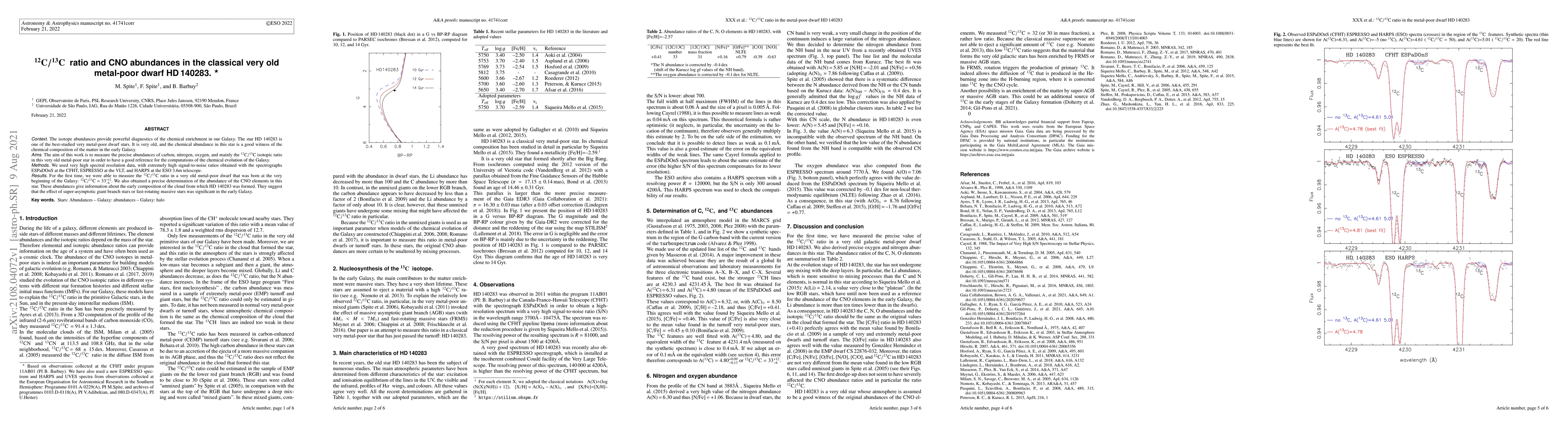 This paper measures the precise carbon isotopic ratio (12C/13C) and CNO abundances in the ancient star HD 140283, providing a reference for early Galaxy chemical evolution. For the first time, the 12C/13C ratio in a very old metal-poor dwarf was determined to be between 27 and 45, suggesting significant contributions from super-asymptotic giant branch stars or fast-rotating massive stars in early Galactic chemistry.