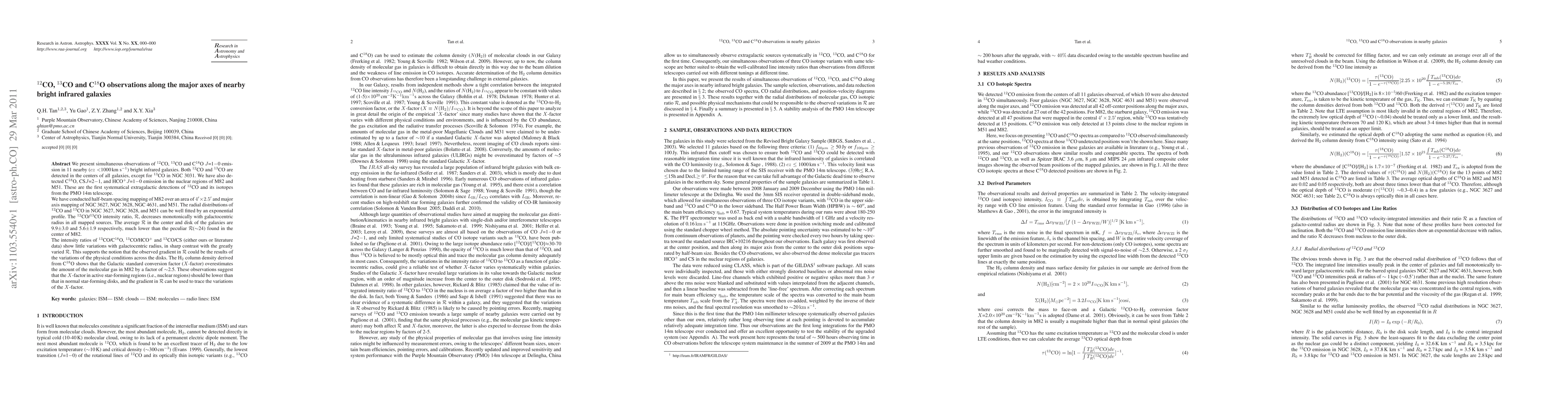 We present simultaneous observations of CO,13CO and C18O J=1-0 emission in 11 nearby (cz<1000 km/s) bright infrared galaxies. Both 12CO and 13CO are detected in the centers of all galaxies, except for 13CO in NGC 3031. We have also detected C18O, CS J=2-1, and HCO+ J=1-0 emission in the nuclear regions of M82 and M51. These are the first systematical extragalactic detections of 12CO and its isotopes from the PMO 14m telescope. We have conducted half-beam spacing mapping of M82 over an area of 4'*2.5' and major axis mapping of NGC 3627, NGC 3628, NGC 4631, and M51. The radial distributions of 12CO and 13CO in NGC 3627, NGC 3628, and M51 can be well fitted by an exponential profile. The 12CO/13CO intensity ratio,R,decreases monotonically with galactocentric radius in all mapped sources. The average R in the center and disk of the galaxies are 9.9+/-3.0 and 5.6+/-1.9 respectively, much lower than the peculiar R(~24) found in the center of M82. The intensity ratios of 13CO/C18O, 13CO/HCO+ and 13CO/CS (either ours or literature data) show little variations with galactocentric radius, in sharp contrast with the greatly varied R. This supports the notion that the observed gradient in R could be the results of the variations of the physical conditions across the disks. The H_2 column density derived from C18O shows that the Galactic standard conversion factor (X-factor) overestimates the amount of the molecular gas in M82 by a factor of ~2.5. These observations suggest that the X-factor in active star-forming regions (i.e., nuclear regions) should be lower than that in normal star-forming disks, and the gradient in R can be used to trace the variations of the X-factor.