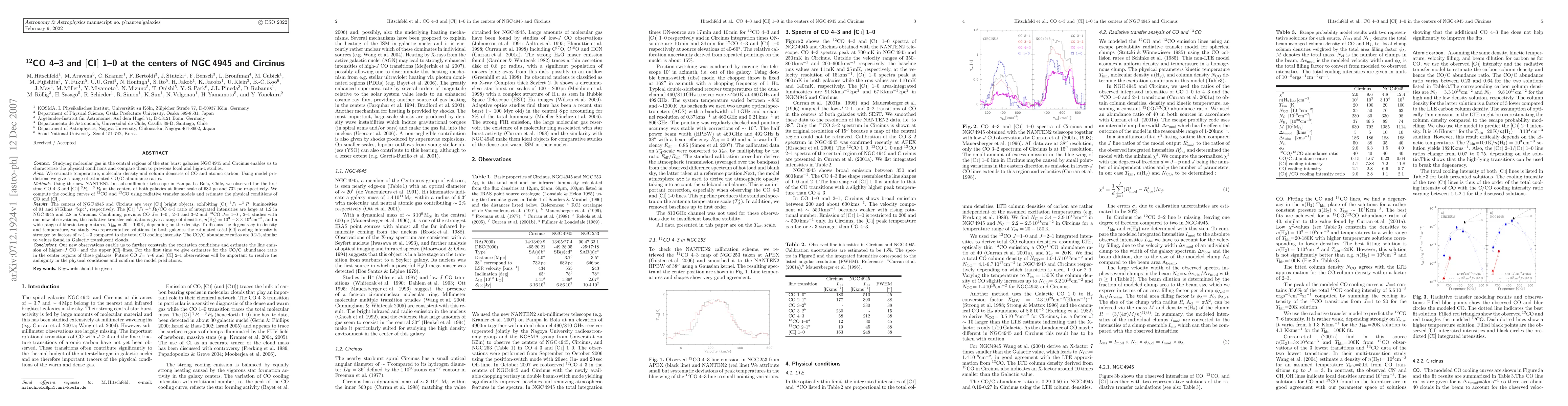 Studying molecular gas in the central regions of the star burst galaxies NGC4945 and Circinus enables us to characterize the physical conditions and compare them to previous local and high-z studies. We estimate temperature, molecular density and column densities of CO and atomic carbon. Using model predictions we give a range of estimated CO/C abundance ratios. Using the new NANTEN2 4m sub-millimeter telescope in Pampa La Bola, Chile, we observed for the first time CO 4-3 and [CI] 3P1-3 P0 at the centers of both galaxies at linear scale of 682 pc and 732 pc respectively. We compute the cooling curves of 12CO and 13CO using radiative transfer models and estimate the physical conditions of CO and [CI]. The centers of NGC4945 and Circinus are very [CI] bright objects, exhibiting [CI] 3P1 - 3 P0 luminosities of 91 and 67Kkms-1kpc2, respectively. The [CI] 3P1-3 P0/CO 4-3 ratio of integrated intensities are large at 1.2 in NGC4945 and 2.8 in Circinus. Combining previous CO J= 1-0, 2-1 and 3-2 and 13CO J= 1-0, 2-1 studies with our new observations, the radiative transfer calculations give a range of densities, n(H2) = 10^3-3*104^cm-3, and a wide range of kinetic temperatures, Tkin = 20 - 100K, depending on the density. Future CO J= 7-6 and [CI] 2-1 observations will be important to resolve the ambiguity in the physical conditions and confirm the model predictions.