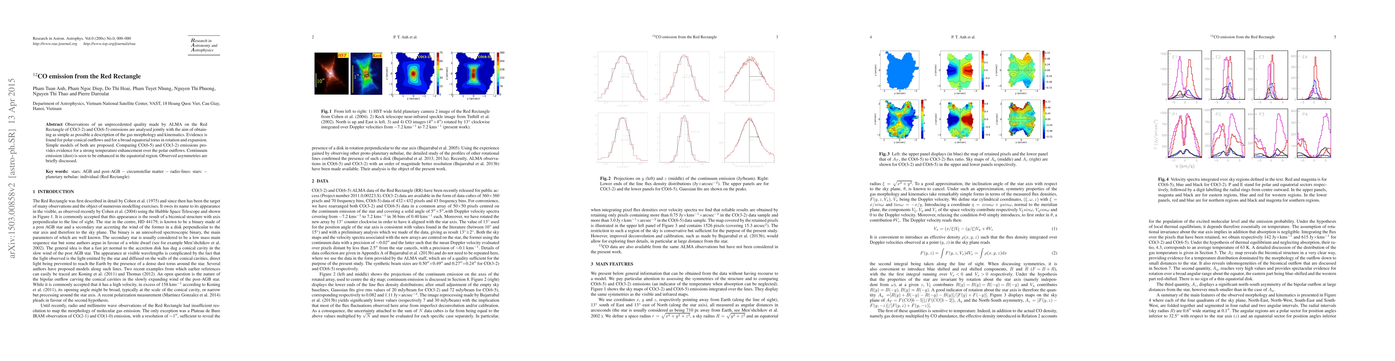Observations of an unprecedented quality made by ALMA on the Red Rectangle of CO(3-2) and CO(6-5) emissions are analysed jointly with the aim of obtaining as simple as possible a description of the gas morphology and kinematics. Evidence is found for polar conical outflows and for a broad equatorial torus in rotation and expansion. Simple models of both are proposed. Comparing CO(6-5) and CO(3-2) emissions provides evidence for a strong temperature enhancement over the polar outflows. Continuum emission (dust) is seen to be enhanced in the equatorial region. Observed asymmetries are briefly discussed.