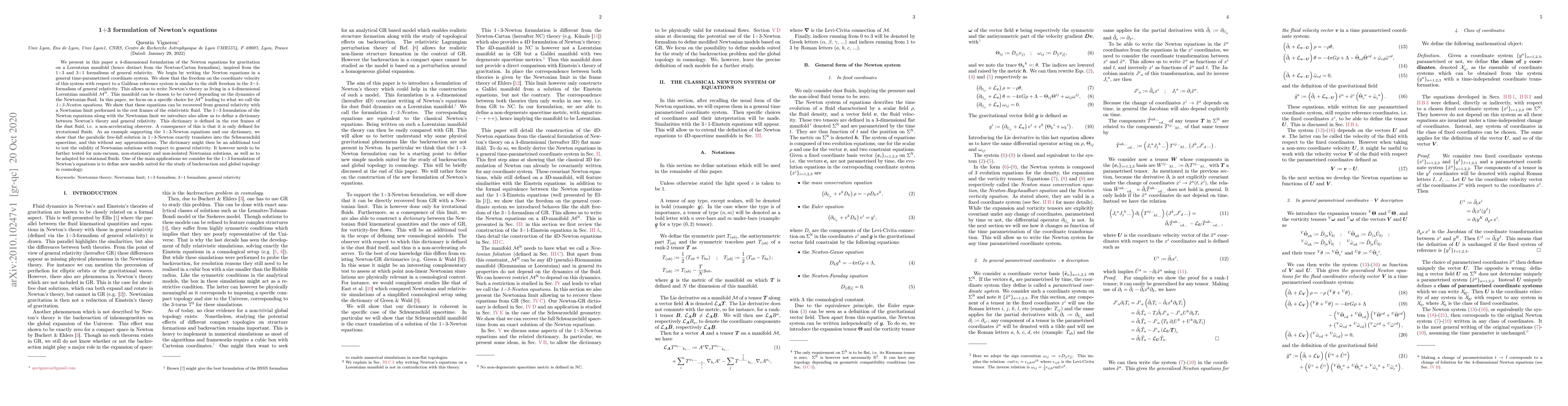 We present in this paper a 4-dimensional formulation of the Newton equations for gravitation on a Lorentzian manifold, inspired from the 1+3 and 3+1 formalisms of general relativity. We first show that the freedom on the coordinate velocity of a general time-parametrised coordinate system with respect to a Galilean reference system is similar to the shift freedom in the 3+1-formalism of general relativity. This allows us to write Newton's theory as living in a 4-dimensional Lorentzian manifold $M^N$. This manifold can be chosen to be curved depending on the dynamics of the Newtonian fluid. In this paper, we focus on a specific choice for $M^N$ leading to what we call the \textit{1+3-Newton equations}. We show that these equations can be recovered from general relativity with a Newtonian limit performed in the rest frames of the relativistic fluid. The 1+3 formulation of the Newton equations along with the Newtonian limit we introduce also allow us to define a dictionary between Newton's theory and general relativity. This dictionary is defined in the rest frames of the dust fluid, i.e. a non-accelerating observer. A consequence of this is that it is only defined for irrotational fluids. As an example supporting the 1+3-Newton equations and our dictionary, we show that the parabolic free-fall solution in 1+3-Newton exactly translates into the Schwarzschild spacetime, and this without any approximations. The dictionary might then be an additional tool to test the validity of Newtonian solutions with respect to general relativity. It however needs to be further tested for non-vacuum, non-stationary and non-isolated Newtonian solutions, as well as to be adapted for rotational fluids. One of the main applications we consider for the 1+3 formulation of Newton's equations is to define new models suited for the study of backreaction and global topology in cosmology.