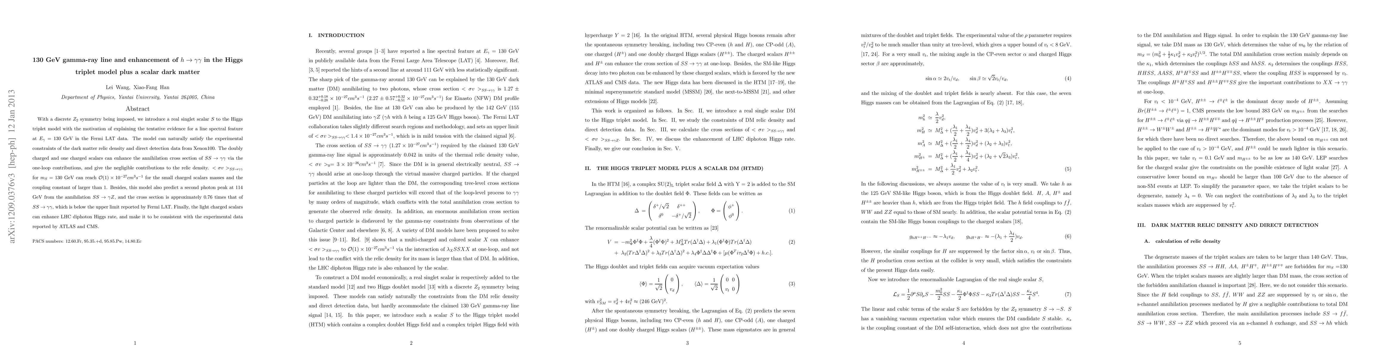 With a discrete $Z_2$ symmetry being imposed, we introduce a real singlet scalar $S$ to the Higgs triplet model with the motivation of explaining the tentative evidence for a spectral feature at $E_\gamma$ = 130 GeV in the Fermi LAT data. The model can naturally satisfy the experimental constraints of the dark matter relic density and direct detection data from Xenon100. The doubly charged and one charged scalars can enhance the annihilation cross section of $SS\to\gamma\gamma$ via the one-loop contributions, and give the negligible contributions to the relic density. $<\sigmav>_{SS\to\gamma\gamma}$ for $m_{S}=130$ GeV can reach $\ord(1)\times10^{-27} cm^3 s^{-1}$ for the small charged scalar masses and the coupling constant of larger than 1. Besides, this model also predict a second photon peak at 114 GeV from the annihilation $SS\to\gamma Z$, and the cross section is approximately 0.76 times that of $SS\to\gamma \gamma$, which is below the upper limit reported by Fermi LAT. Finally, the light charged scalars can enhance LHC diphoton Higgs rate, and make it to be consistent with the experimental data reported by ATLAS and CMS.