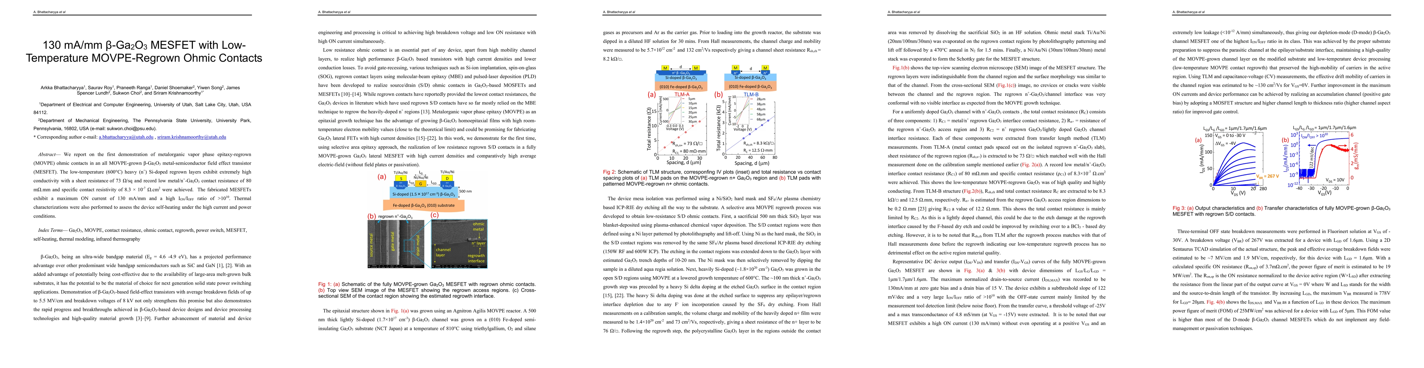 We report on the demonstration of metalorganic vapor phase epitaxy-regrown (MOVPE) ohmic contacts in an all MOVPE-grown $\beta$-Ga$_2$O$_3$ metal-semiconductor field effect transistor (MESFET). The low-temperature (600$^{\circ}$C) heavy (n$^{+}$) Si-doped regrown layers exhibit extremely high conductivity with sheet resistance of 73 $\Omega$/$\square$ and record low metal/n$^{+}$-Ga$_2$O$_3$ contact resistance of 80 m$\Omega$.mm and specific contact resistivity of 8.3$\times$10$^{-7}$ $\Omega$.cm$^{2}$ were achieved. The fabricated MESFETs exhibit a maximum drain-to-source current of 130 mA/mm, a high I$_{ON}$/I$_{OFF}$ of $>$10$^{10}$ with a high power FOM of 25 MW/cm$^{2}$ were achieved without any field plates. Nanoparticle-assisted Raman thermometry, thermal modeling, and infrared thermography were performed to assess the device self-heating under the high current and power conditions. This demonstration shows the promise of MOVPE technique for the realization of high-performance lateral $\beta$-Ga$_2$O$_3$ devices and also highlights the need for device-level thermal management.